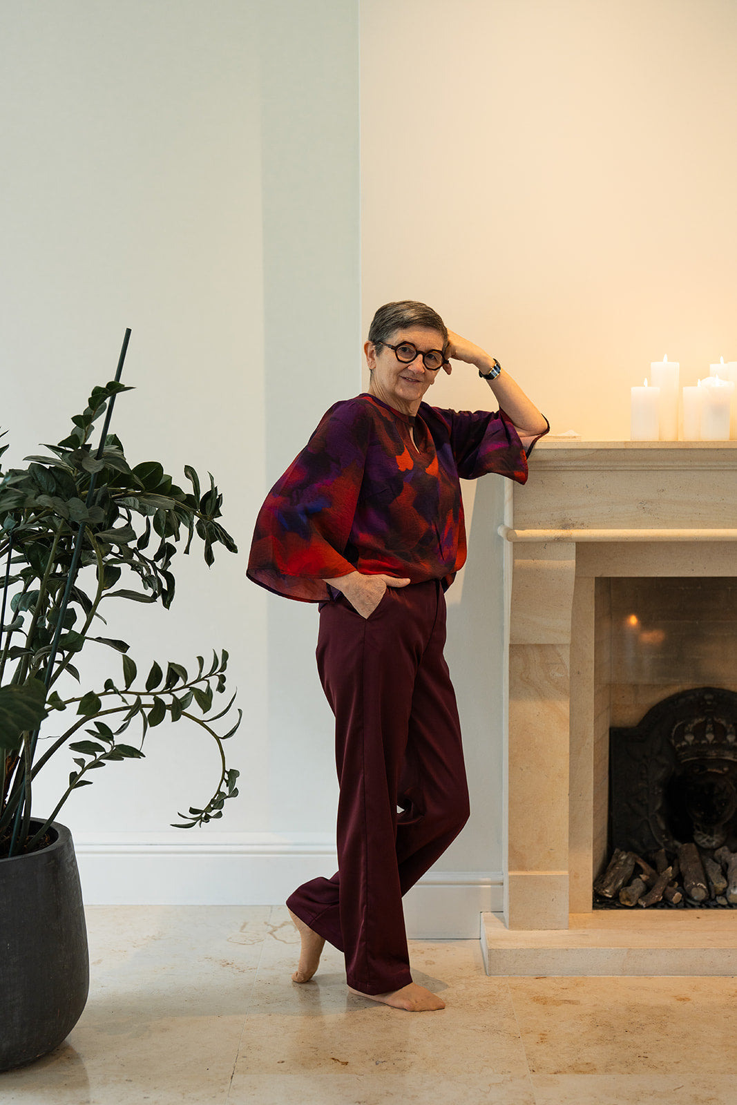 Cocamia is een bordeaux, satijnen broek met rechte pijpen en elastiek in de taille.