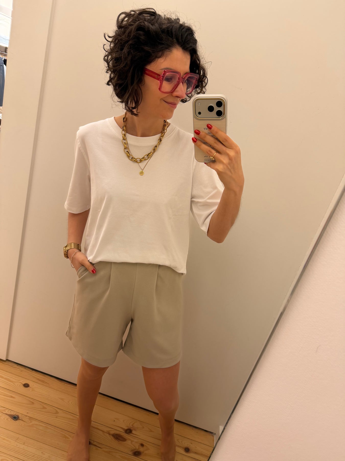 Phoebe is een short met elastiek in de taille, bandplooien en 2 steekzakken.