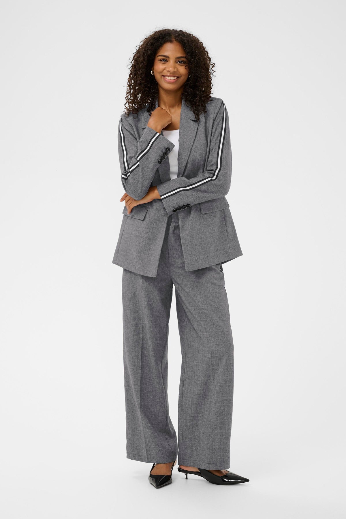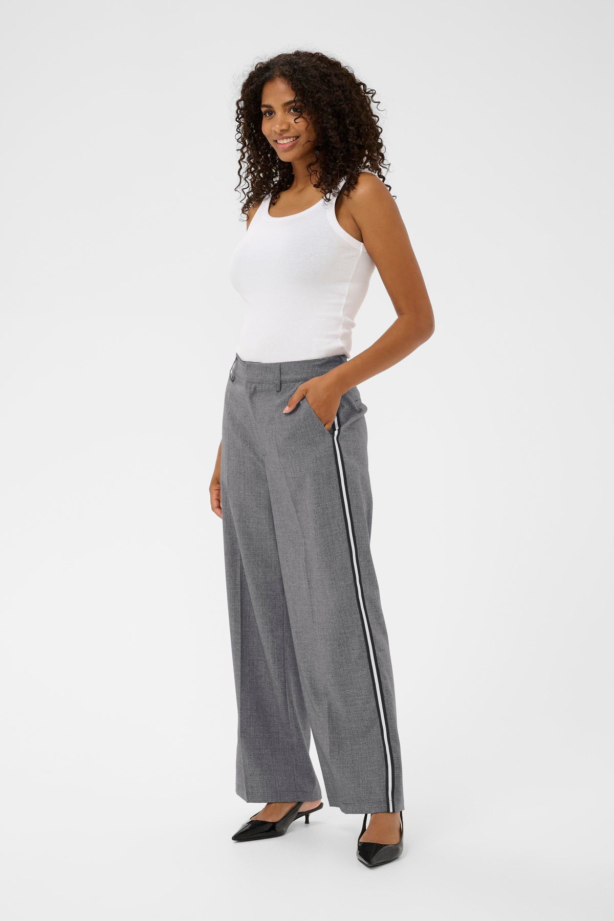 Ramona is een grijze broek met brede pijpen en zwart/witte bies op de zijkant.