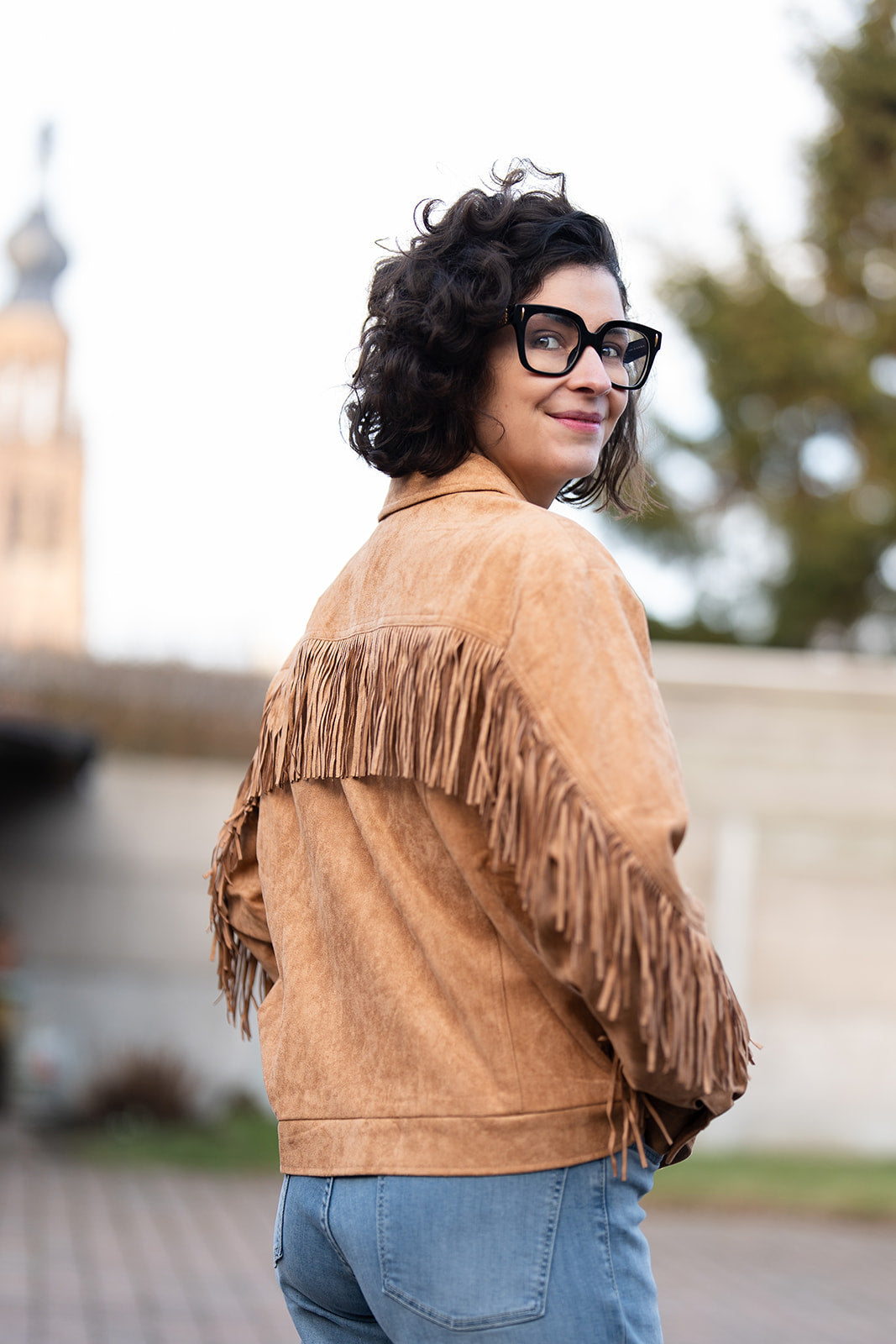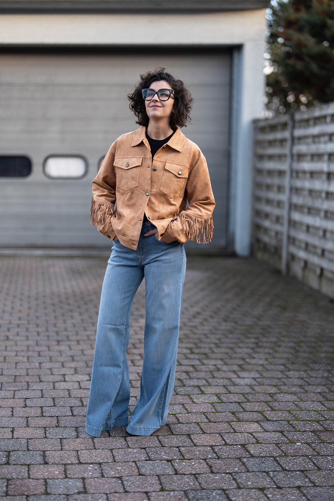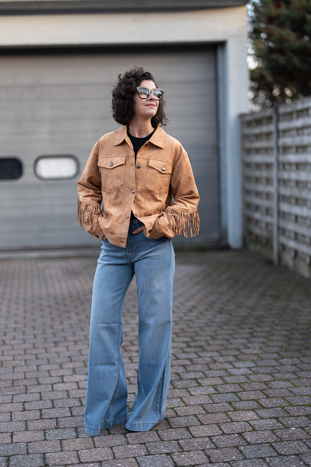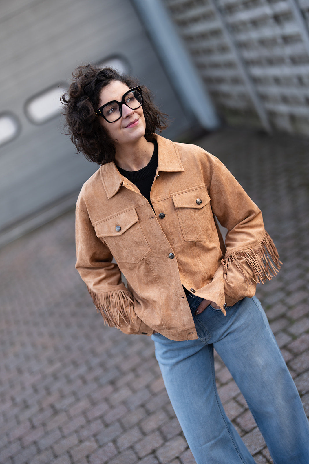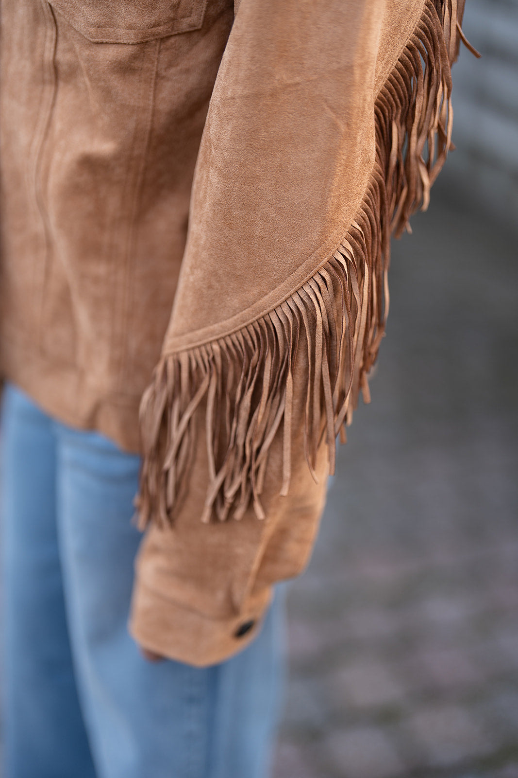 Aria is een camel suède (geen echt) vest met knoopsluiting, lange mouwen en franjes. Het vestje is gevoerd.