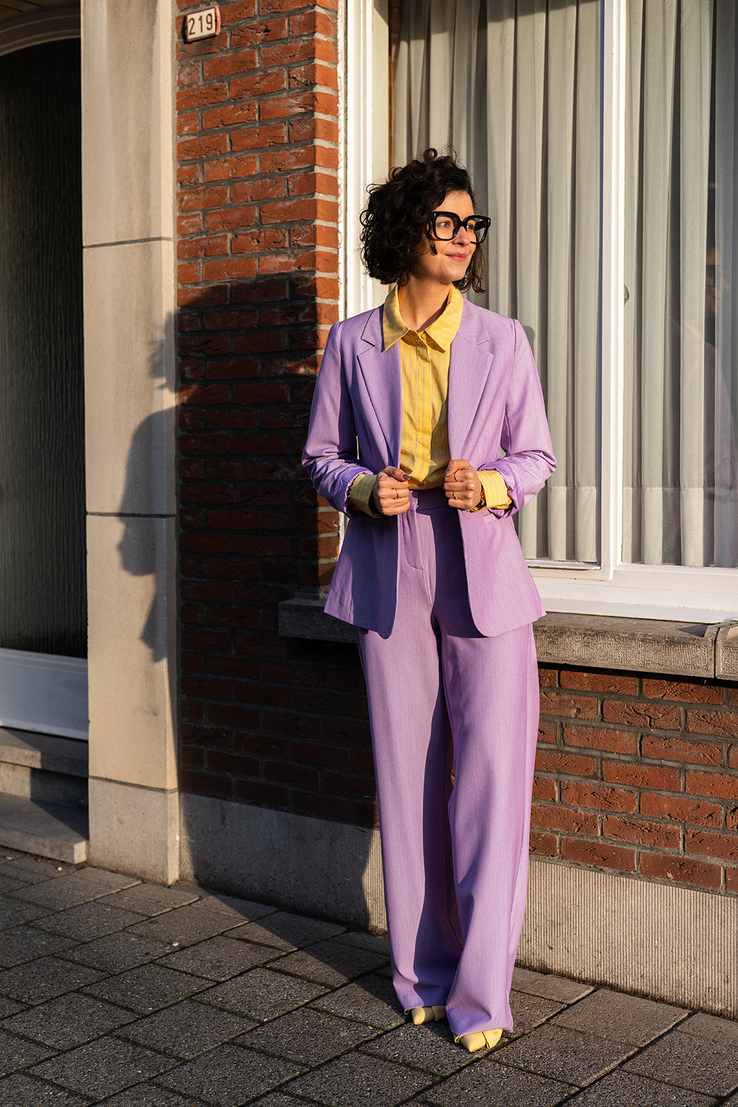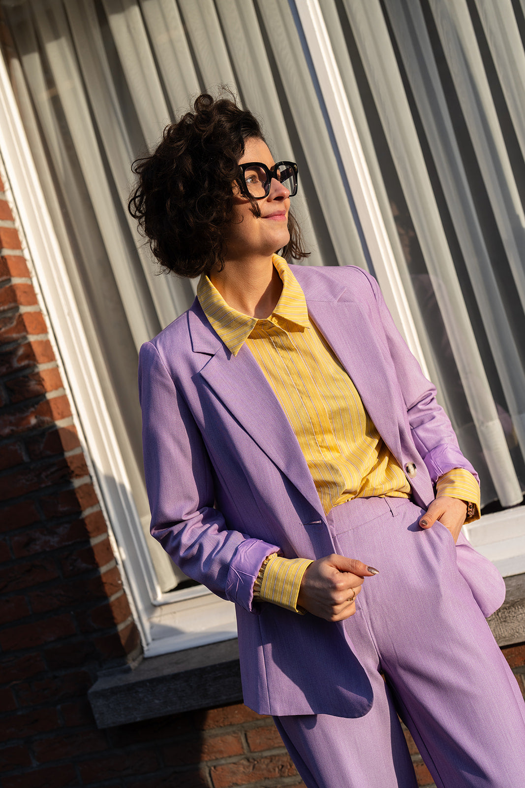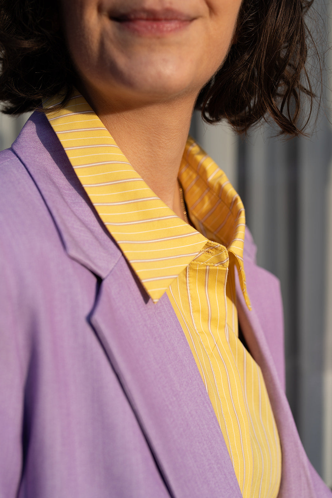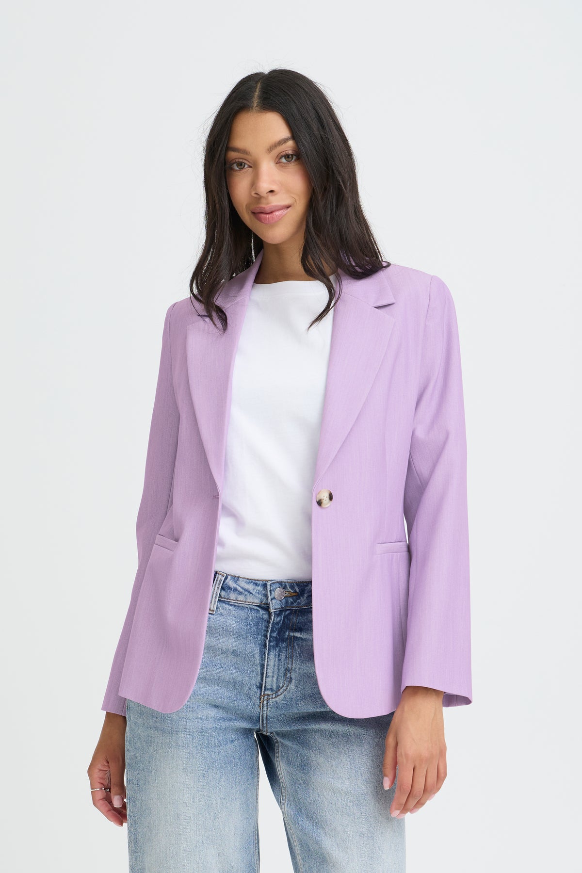 Danta is een lila blazer met reverskraag en lange mouwen. De blazer is gevoerd.Fitting: valt op maatSamenstelling: 64% polyester, 32% viscose, 4% elasthan