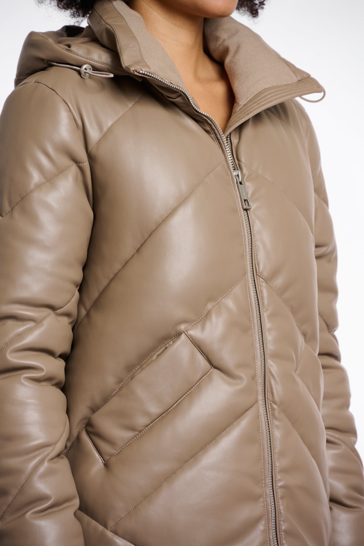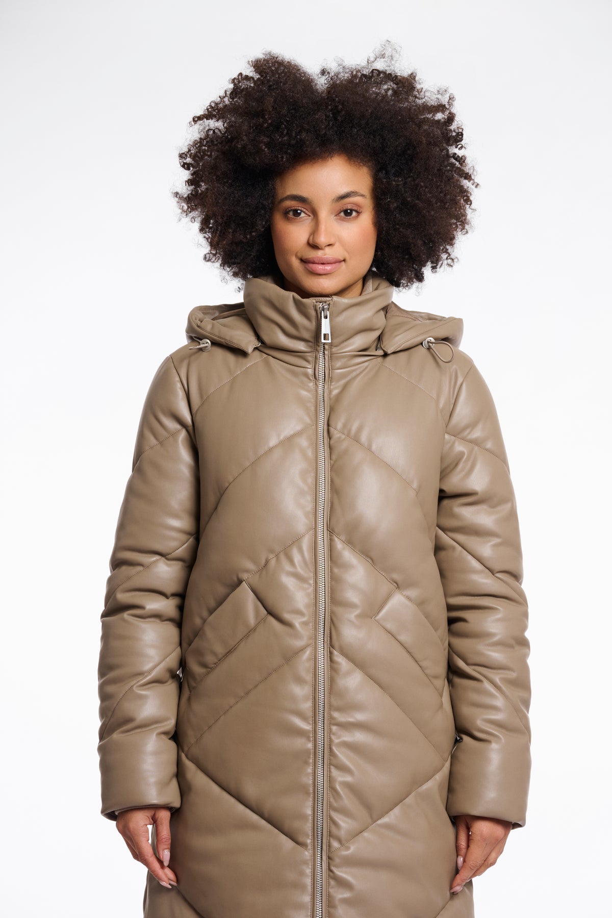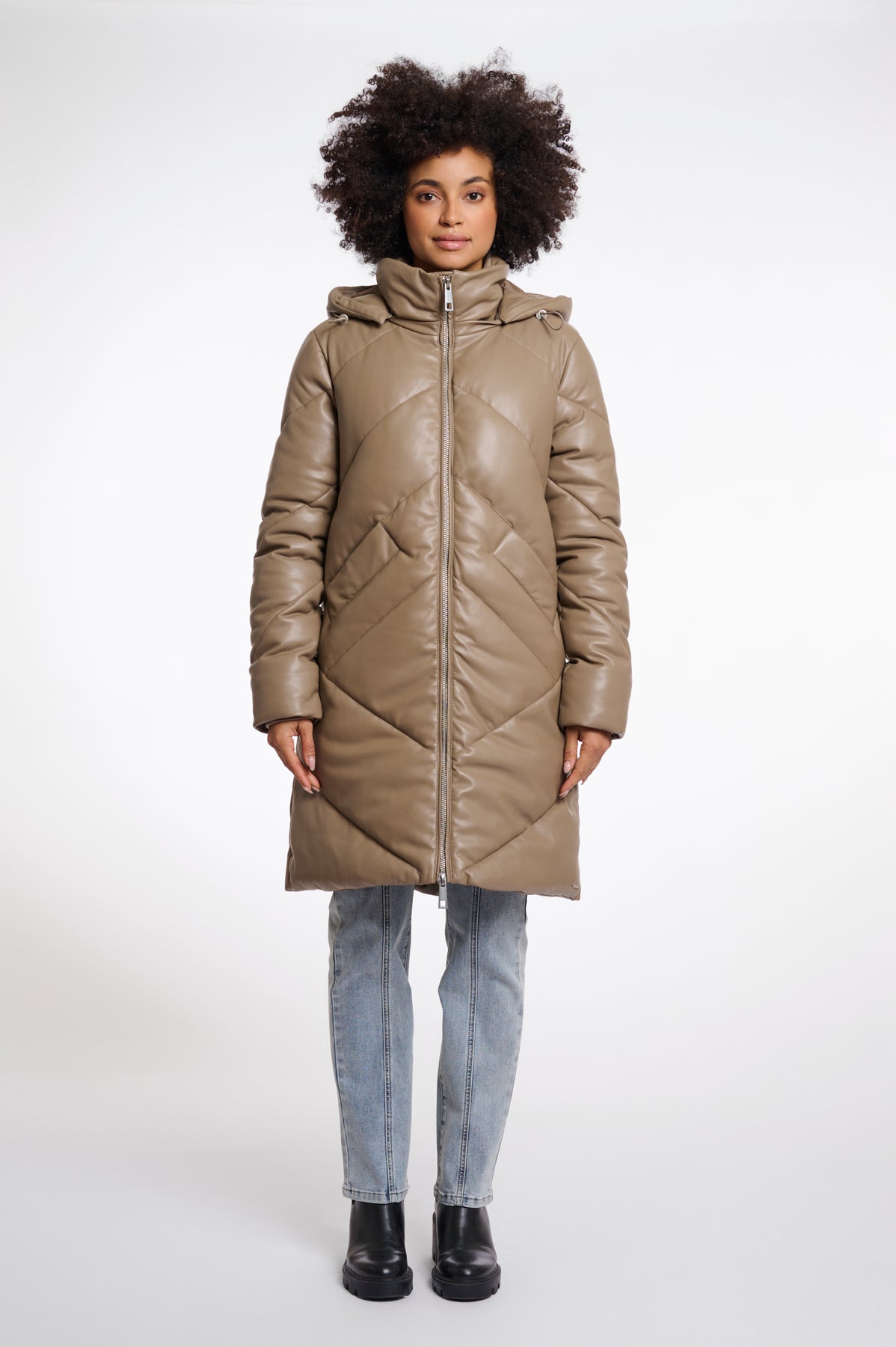 Frida is een taupekleurige jas op knielengte. De jas heeft een afneembare kap en sluit met een rits.Fitting: valt op maatSamenstelling: 100% polyester