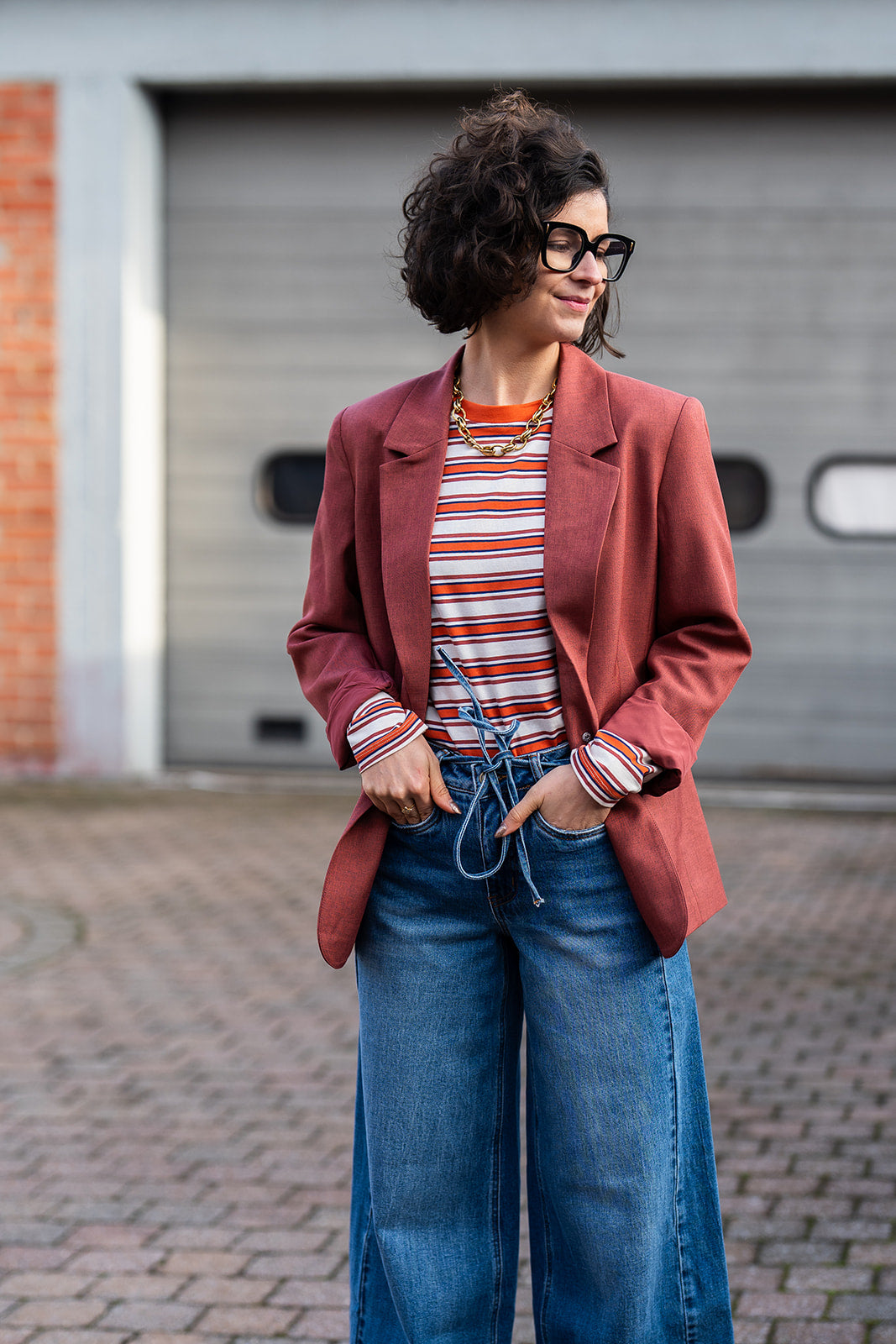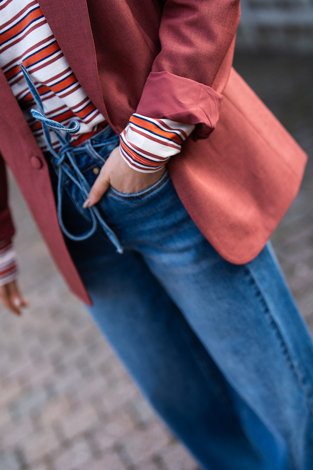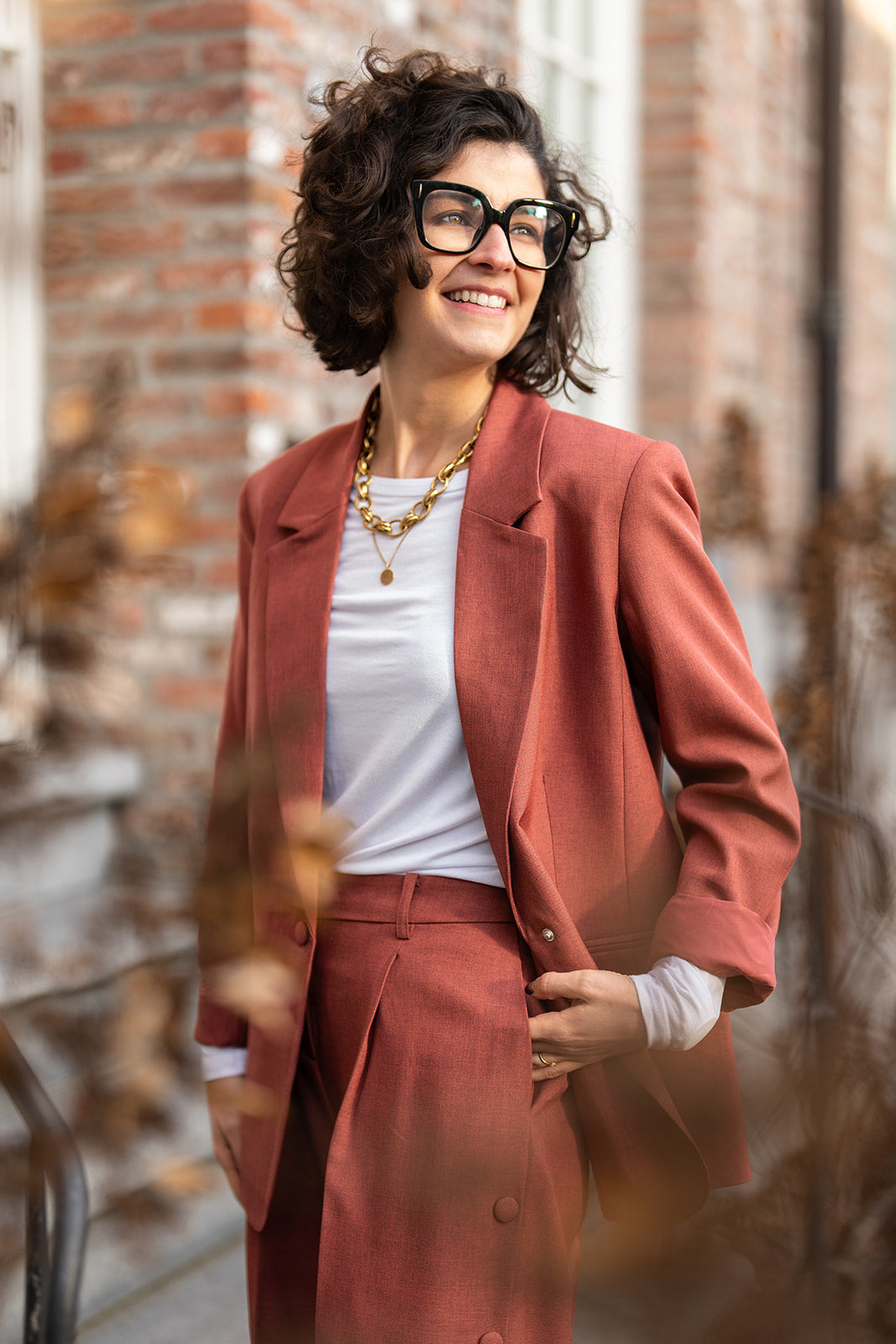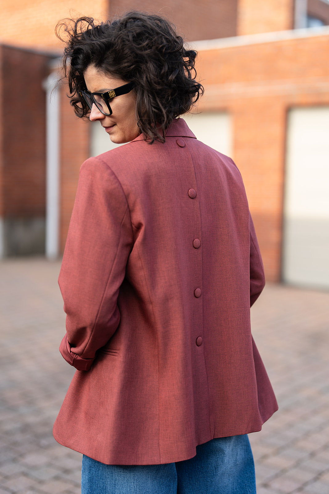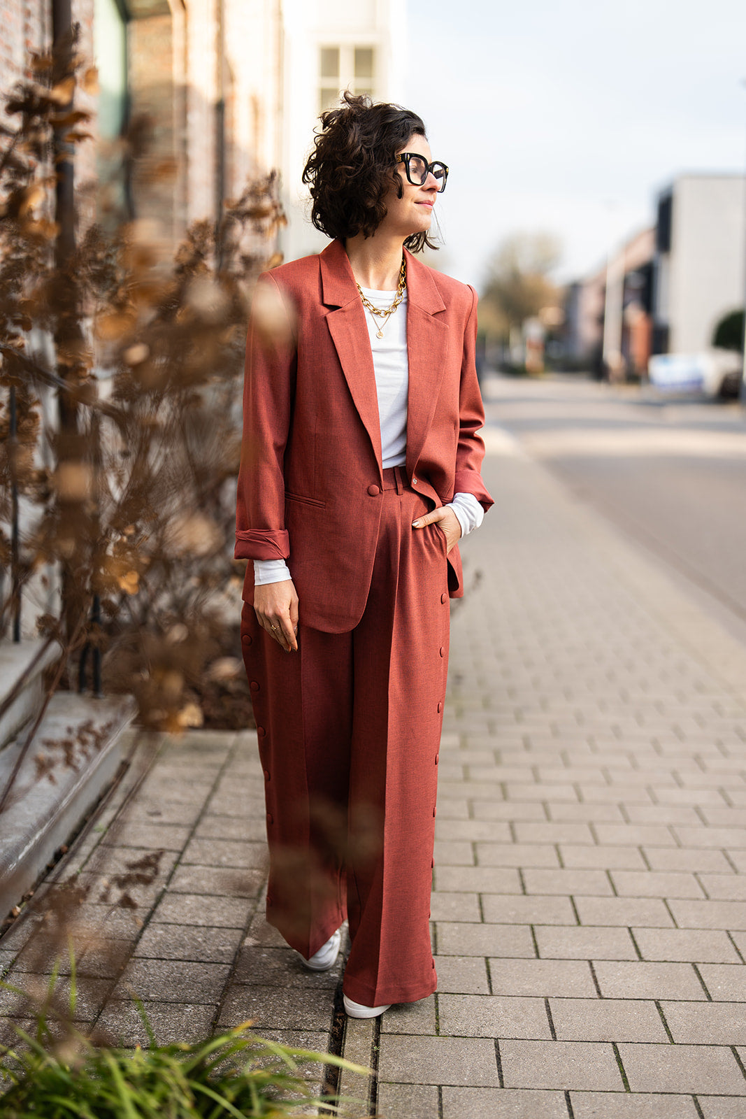 Lexi is een roestbruine blazer met reverskraag en knoopdetail op de rug.