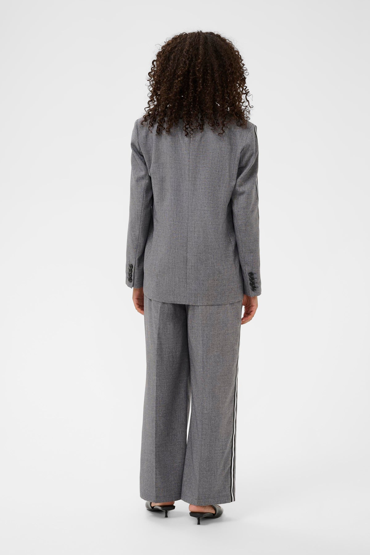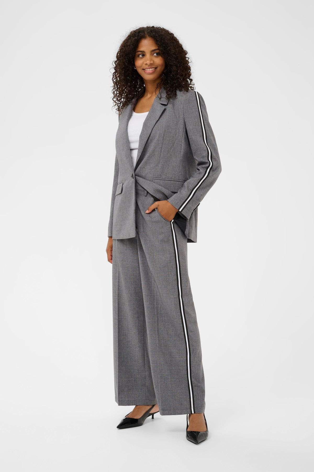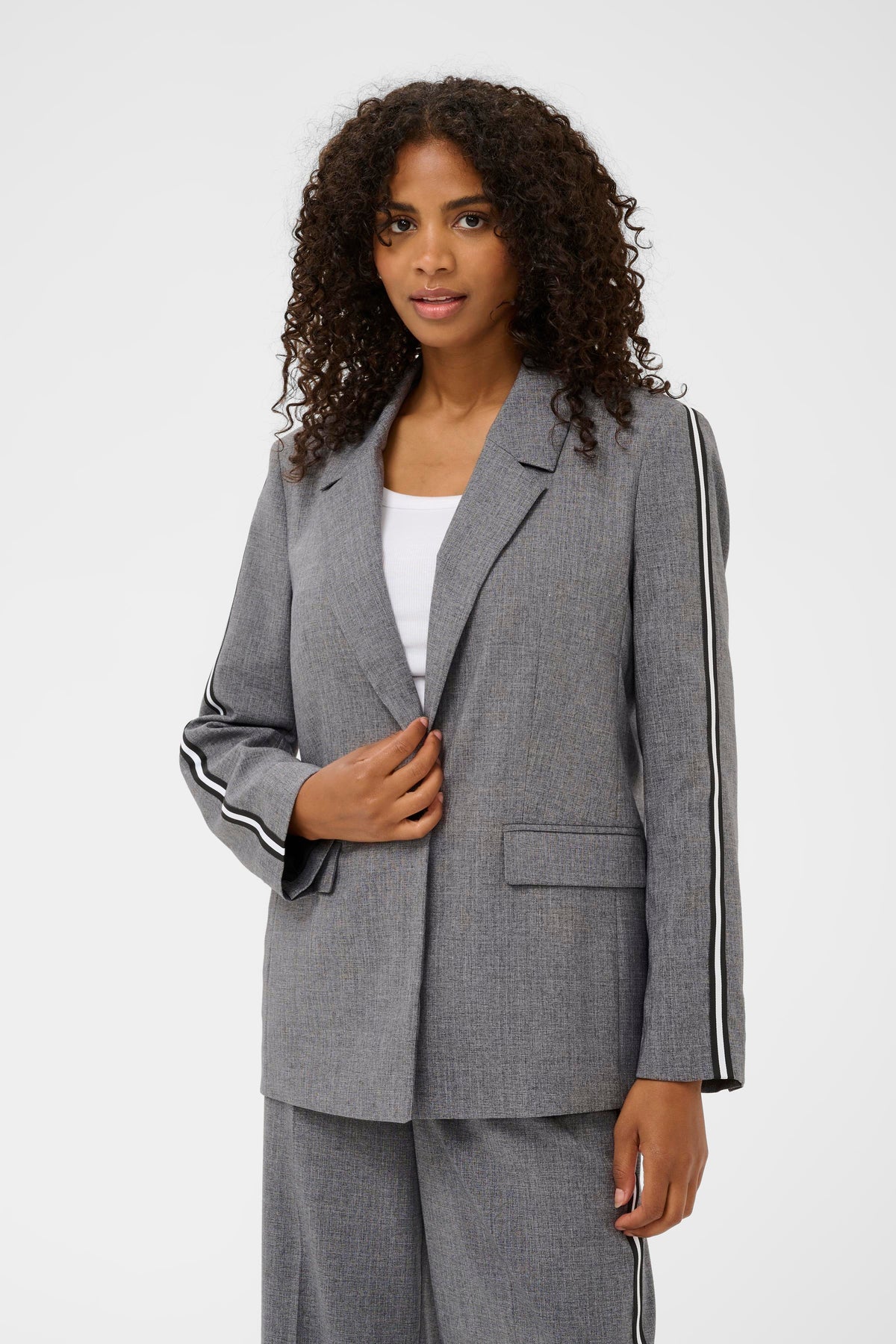 Ramona is een grijze blazer met reverskraag en zwart/witte bies op de mouwen. De blazer is gevoerd.