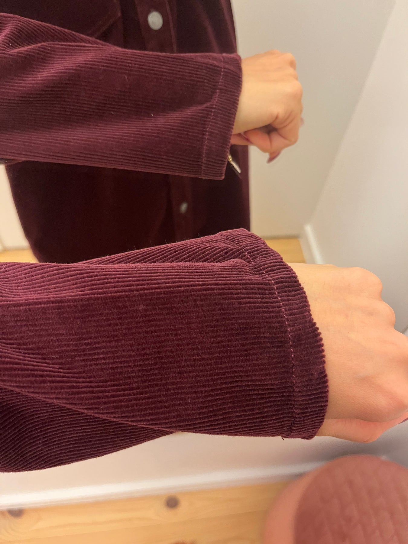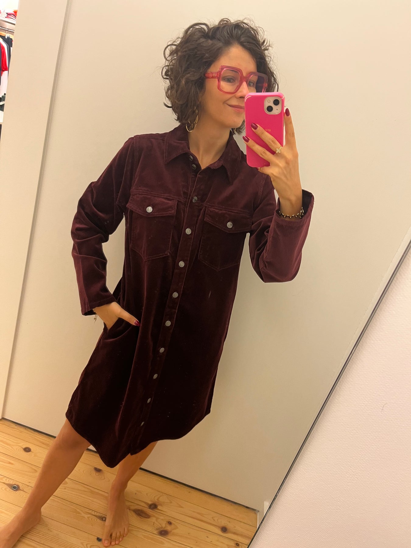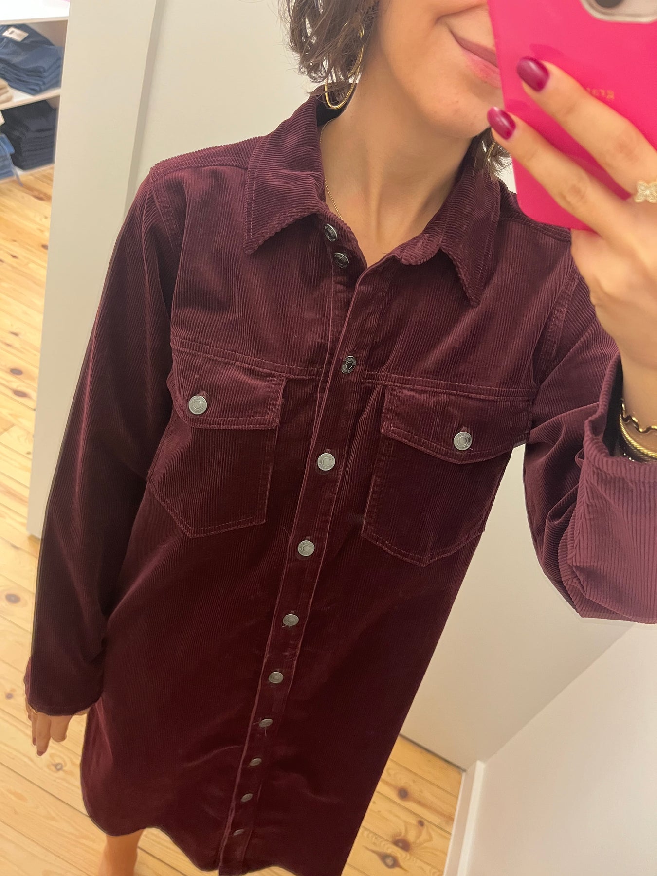 Cordy is een bordeaux, ribfluwelen hemdsjurk met lange mouwen.