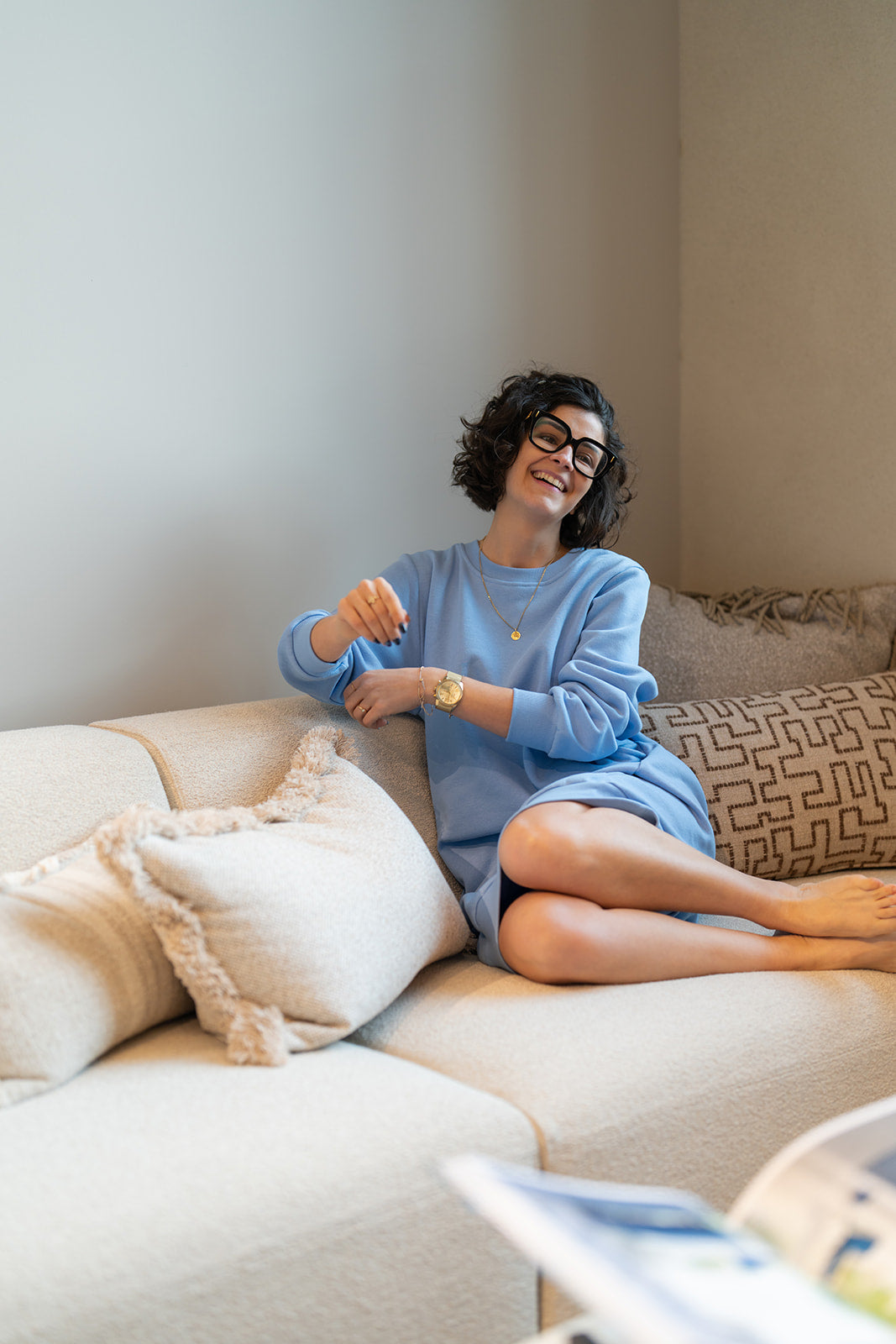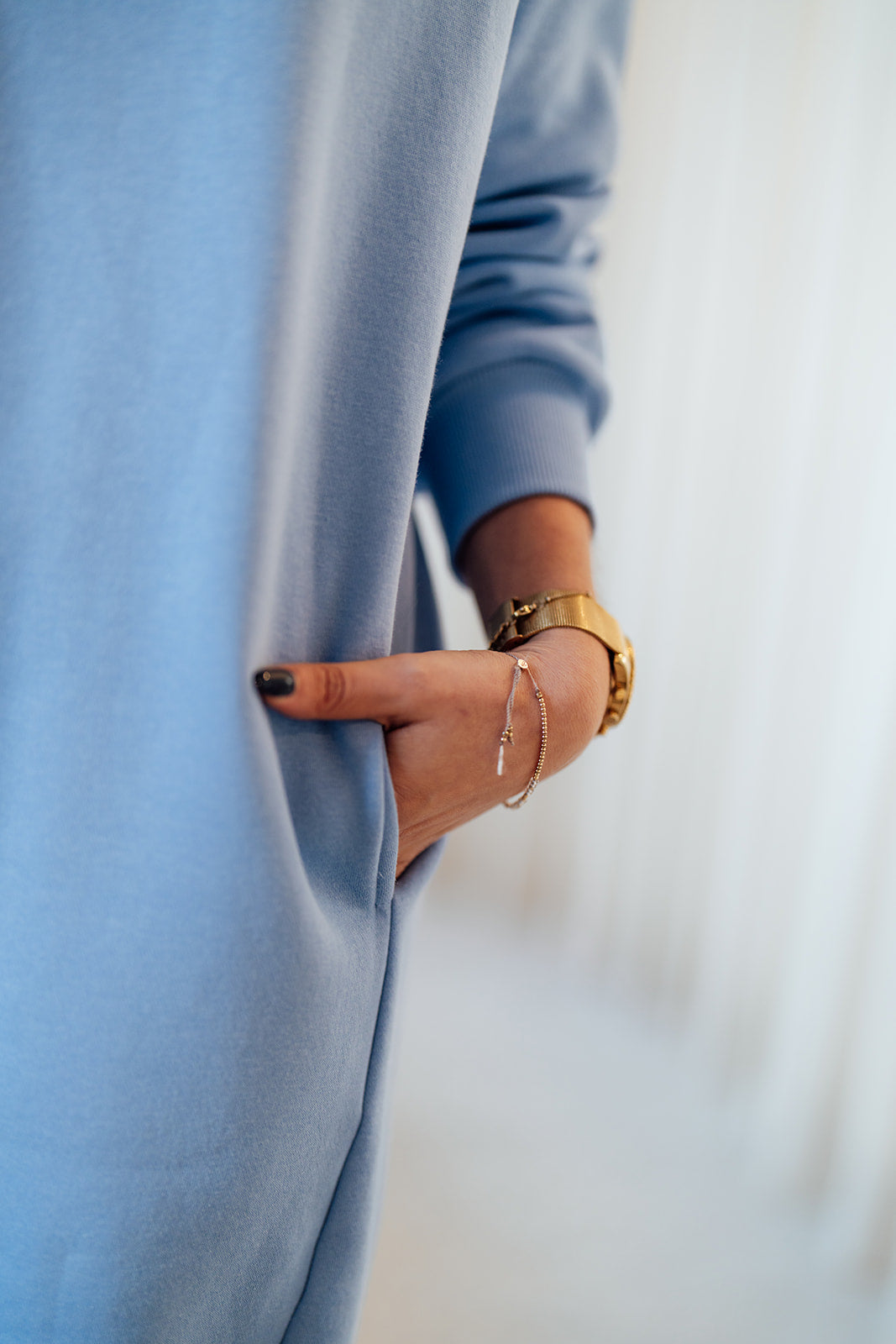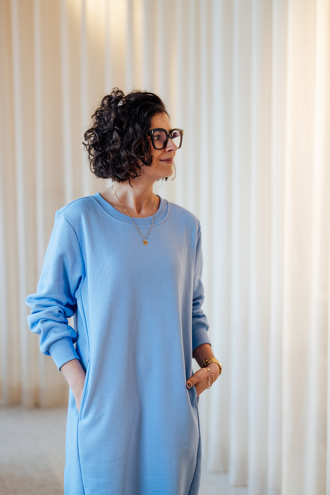 Kamela is een blauwe sweaterjurk op knielengte, met ronde hals, lange mouwen en 2 steekzakken.