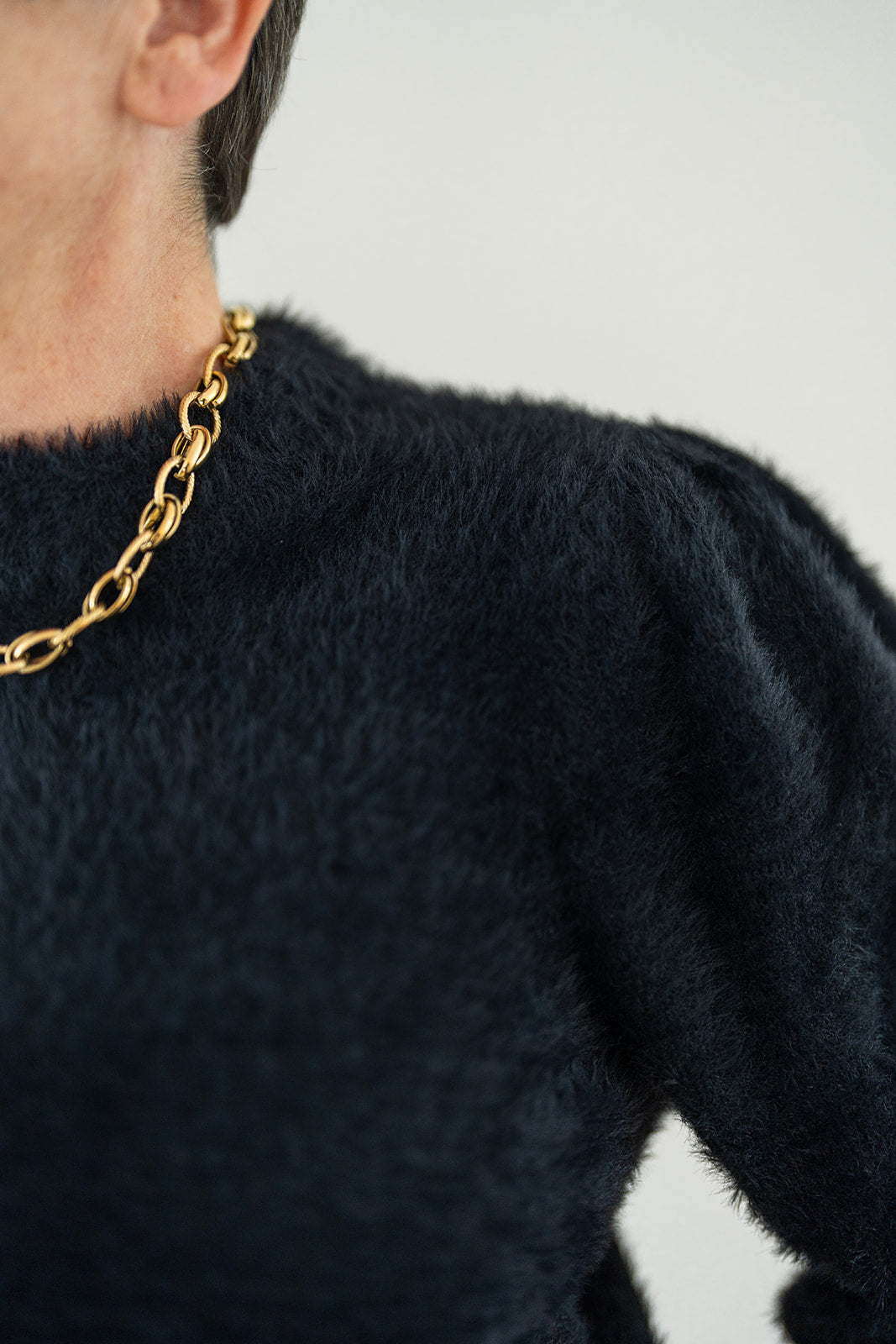 Banni is een zwarte, fluffy trui met ronde hals en 3/4e mouwen.Fitting: valt op maatSamenstelling: 100% polyamide