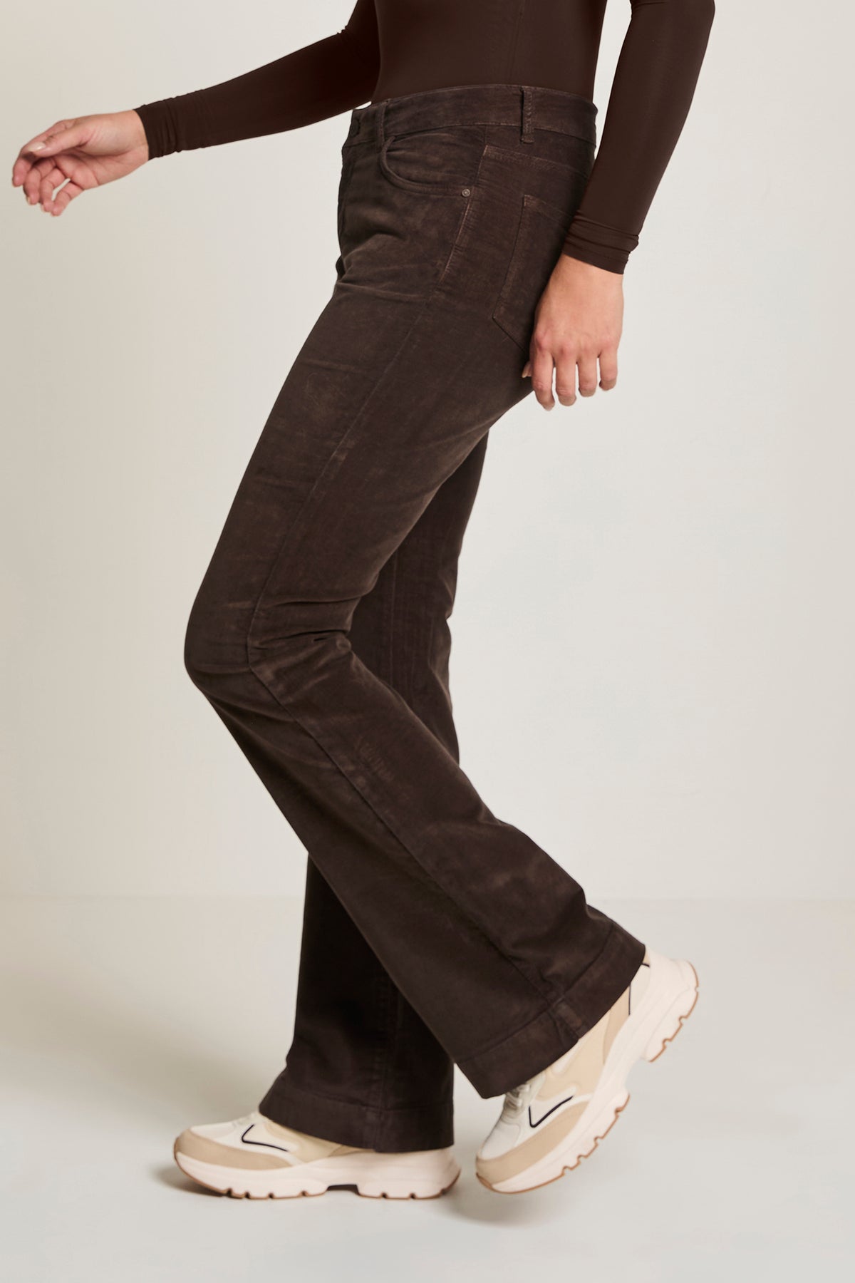 Jade is een donkerbruine, fluwelen broek in flared fit.Fitting: valt op maatSamenstelling: 98% katoen, 2% elasthan