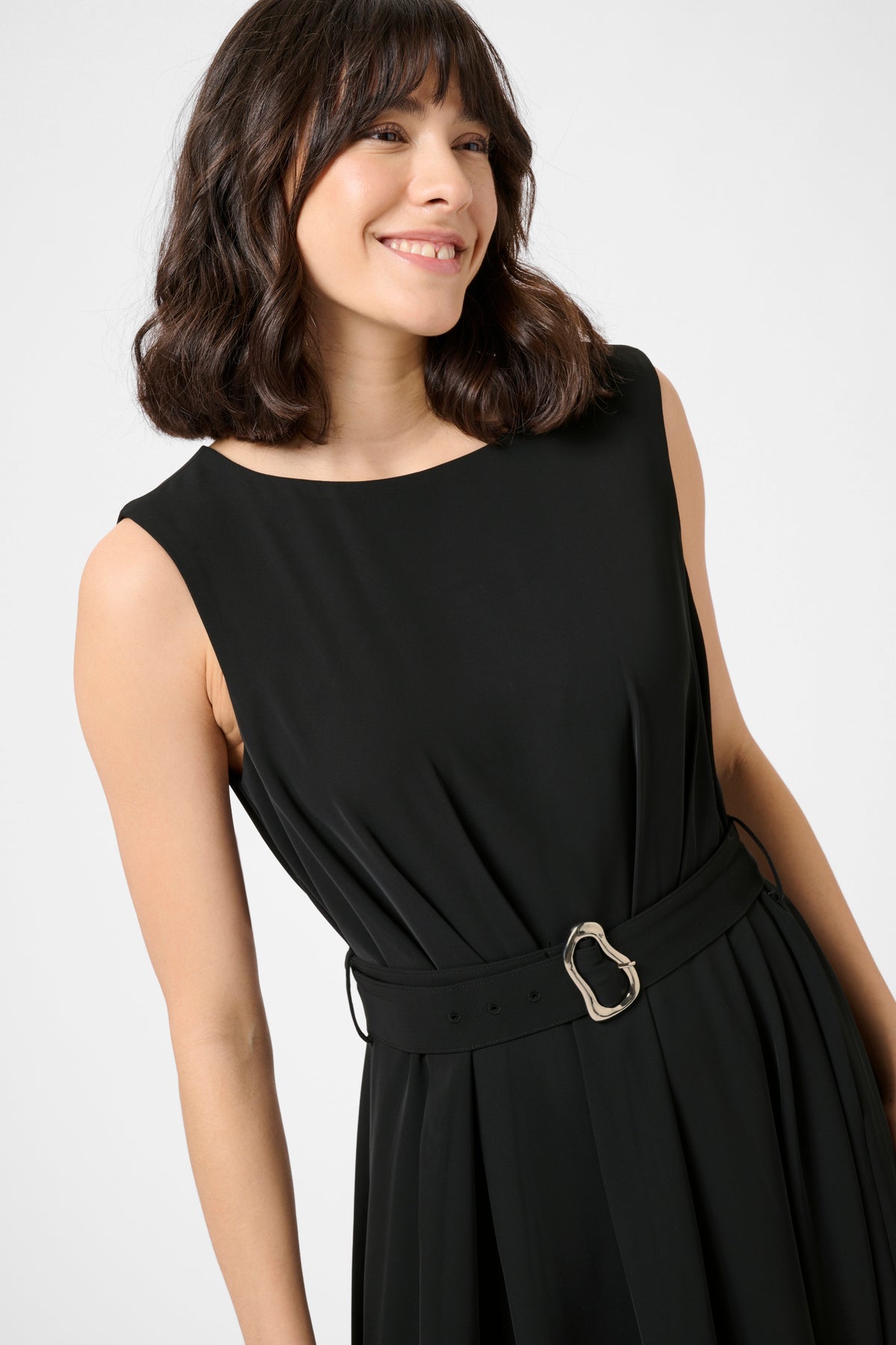 Olga is een zwarte, lange jurk met ronde hals en split achteraan. De jurk is gevoerd en heeft zakken in de zijnaad.Fitting: valt iets ruimerSamenstelling: 100% polyester