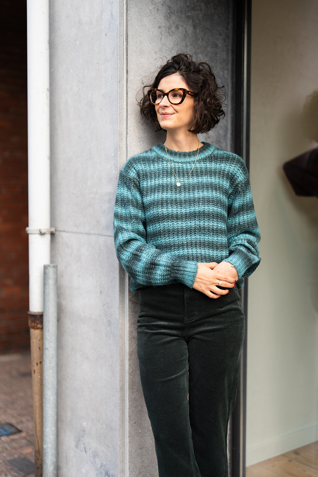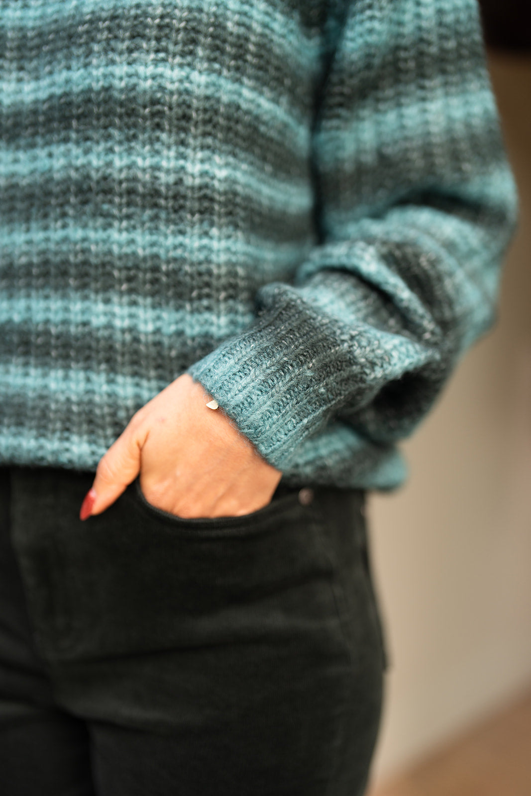 Riva is een groene gestreepte trui met ronde hals en lange mouwenFitting: valt ruimerSamenstelling: 35% acryl, 32% polyester, 25% nylon, 8% wol
