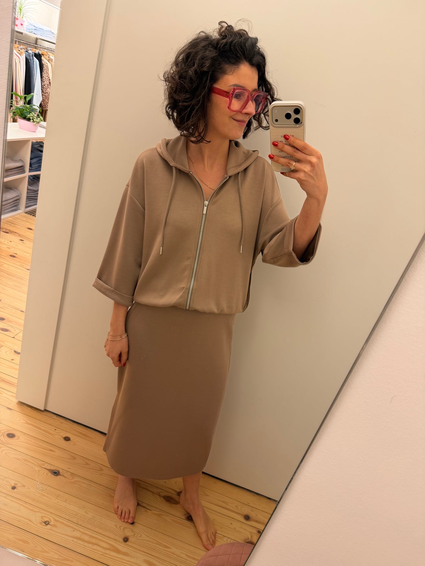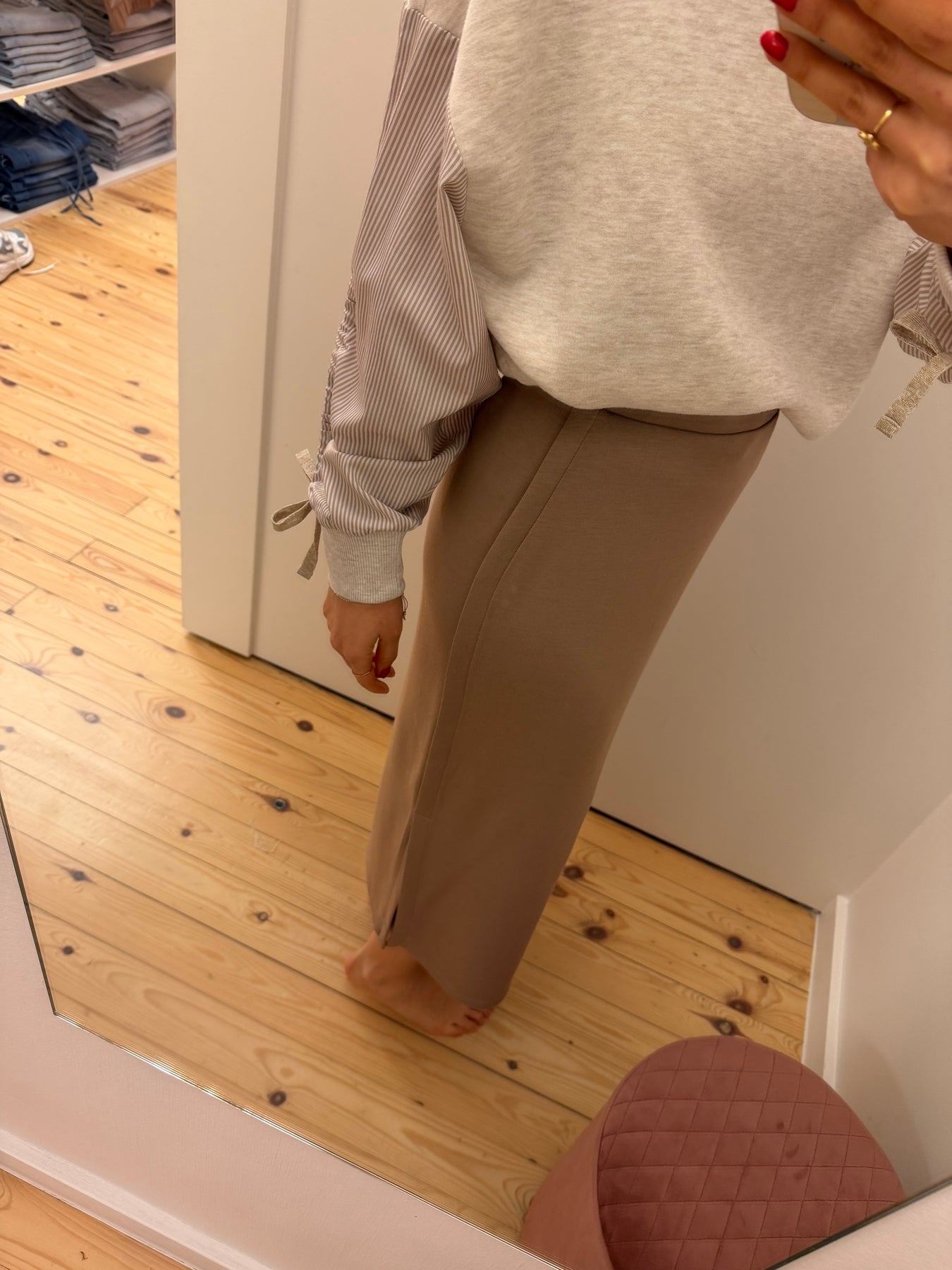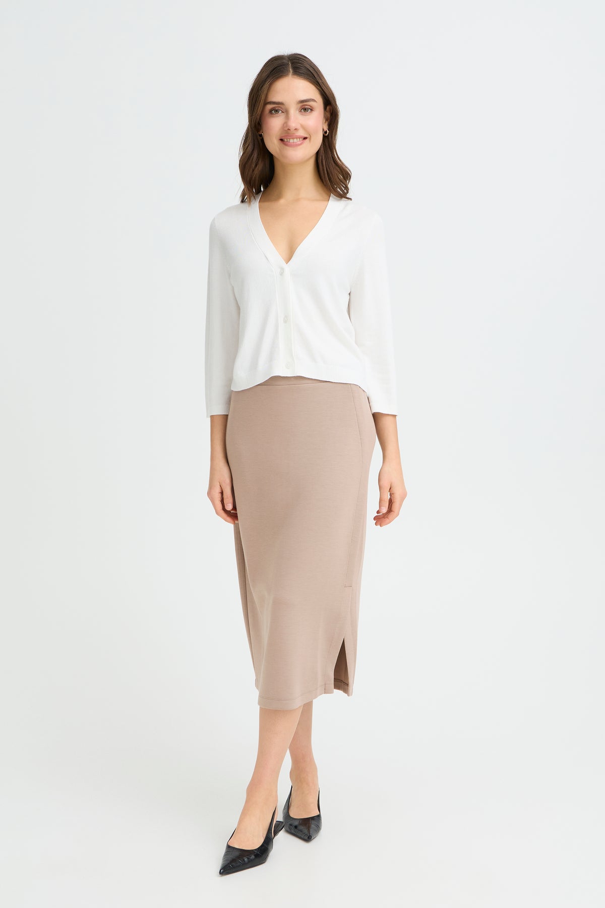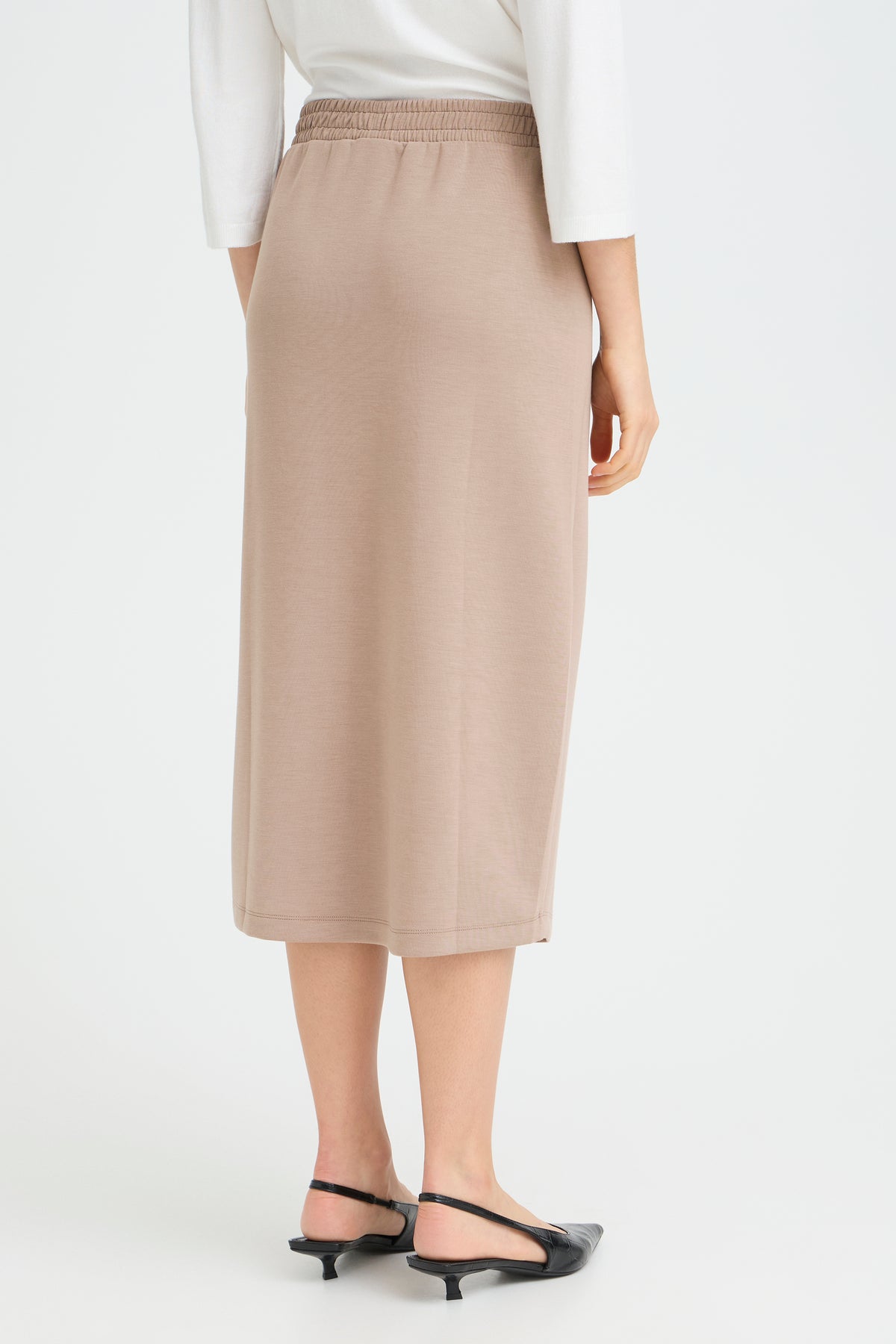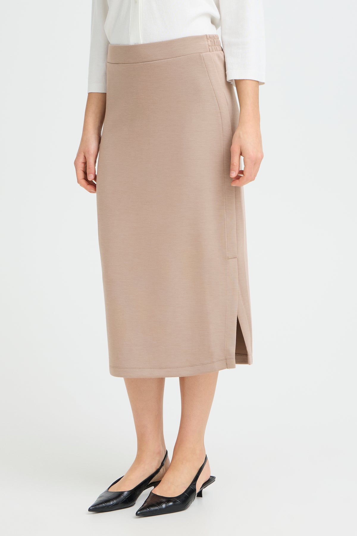 Aurora is een halflange, taupekleurige rok met elastiek in de taille en split in de zijnaad.