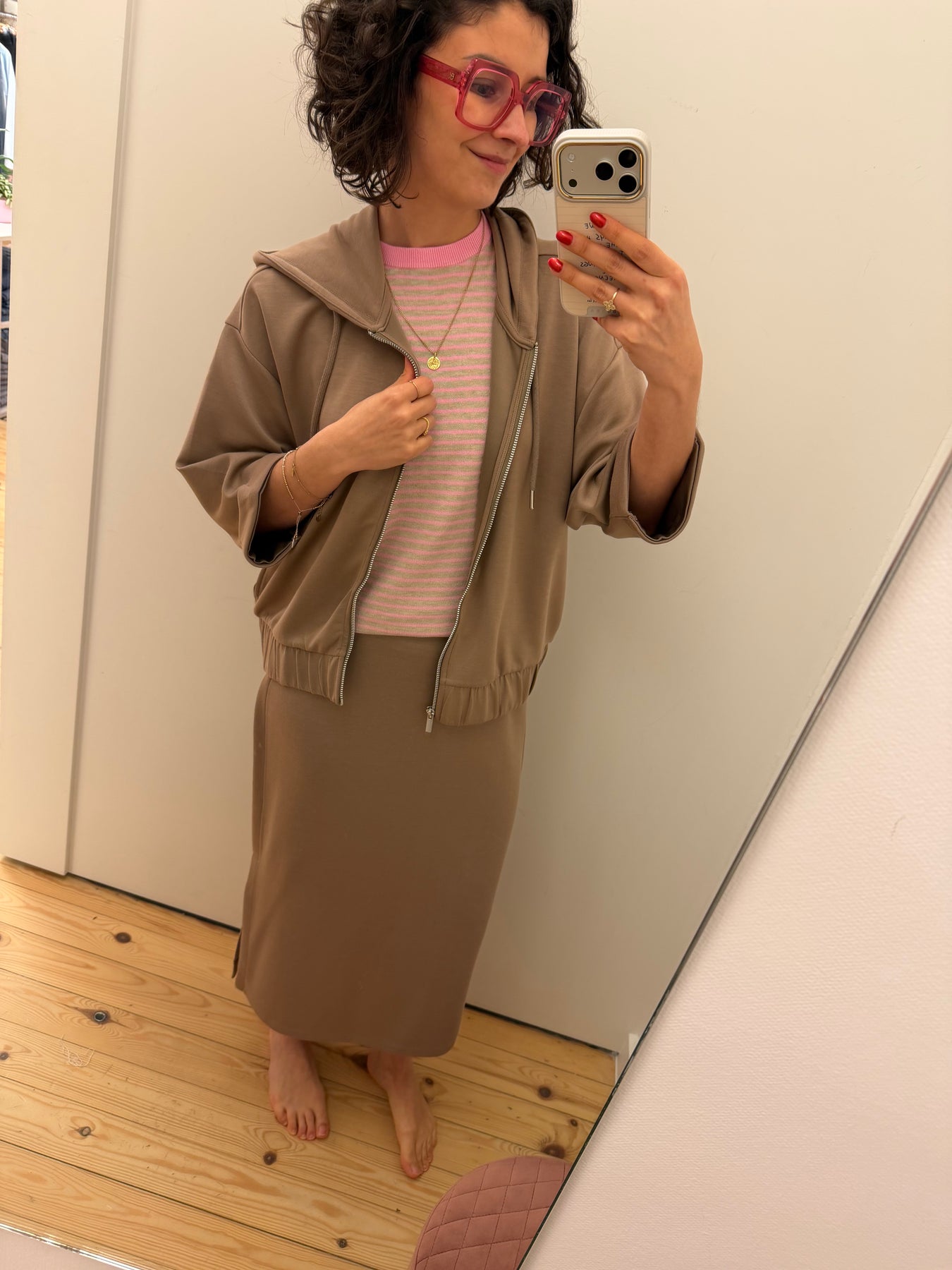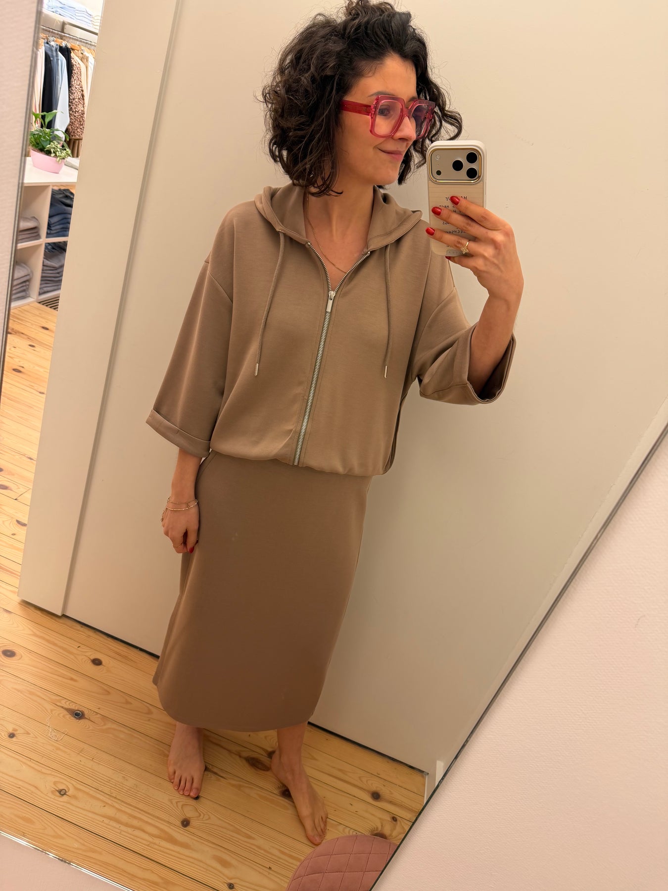 Aurora is een taupekleurig vestje met kap, ritssluiting, halflange mouwen en zakken in de zijnaad.