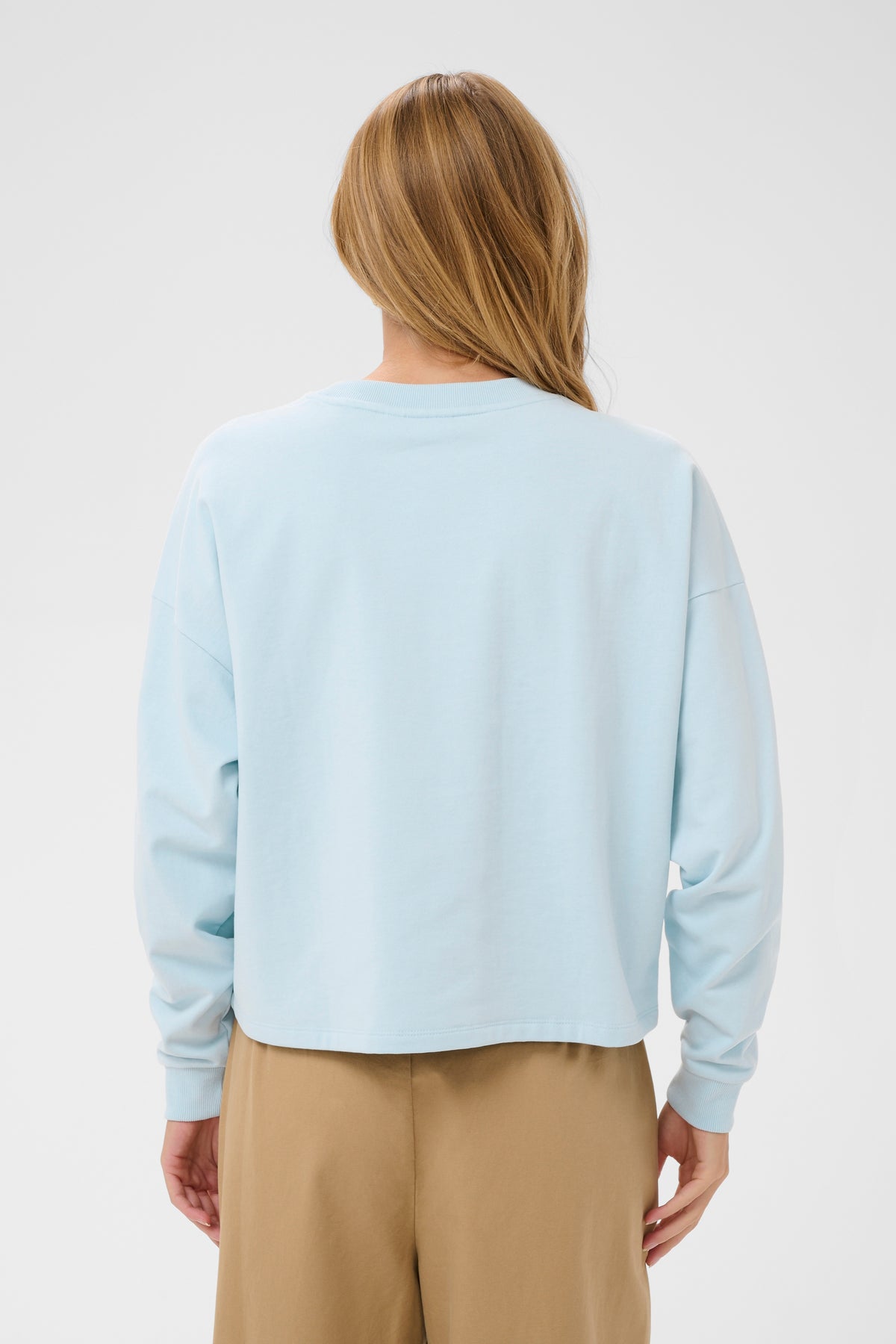Pegrina is een lichtauwe sweater met ronde hals, lange mouwen en rode opdruk.