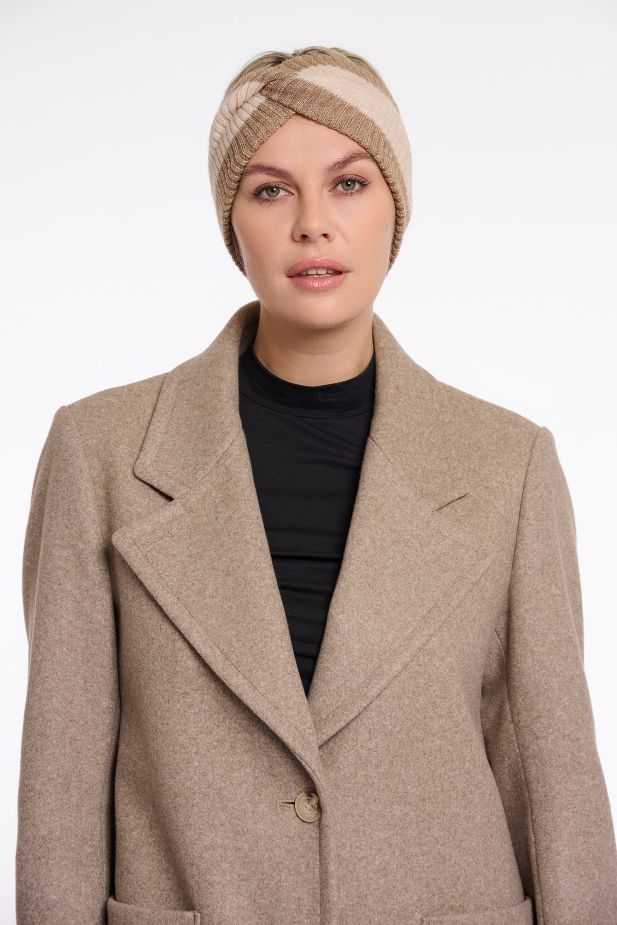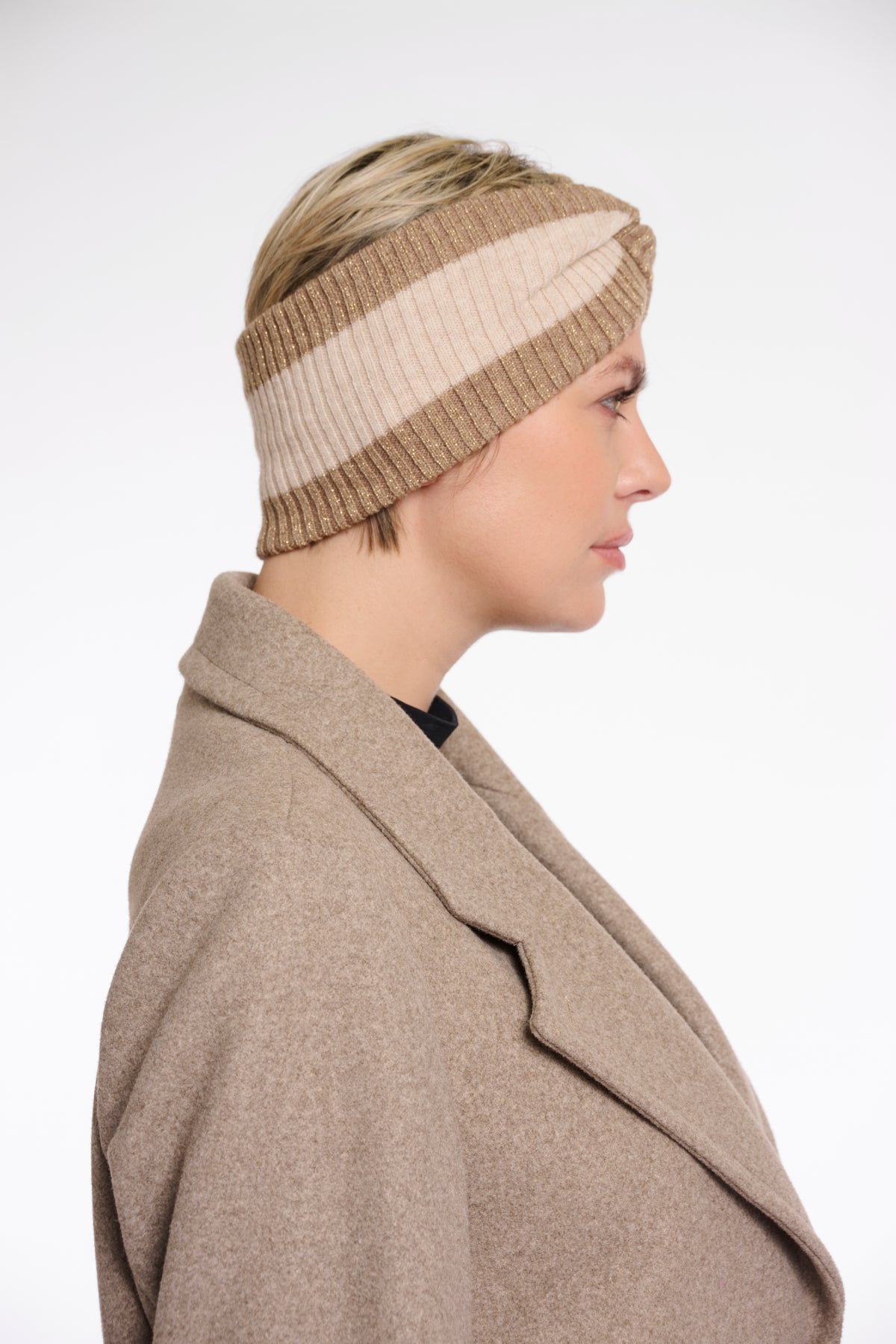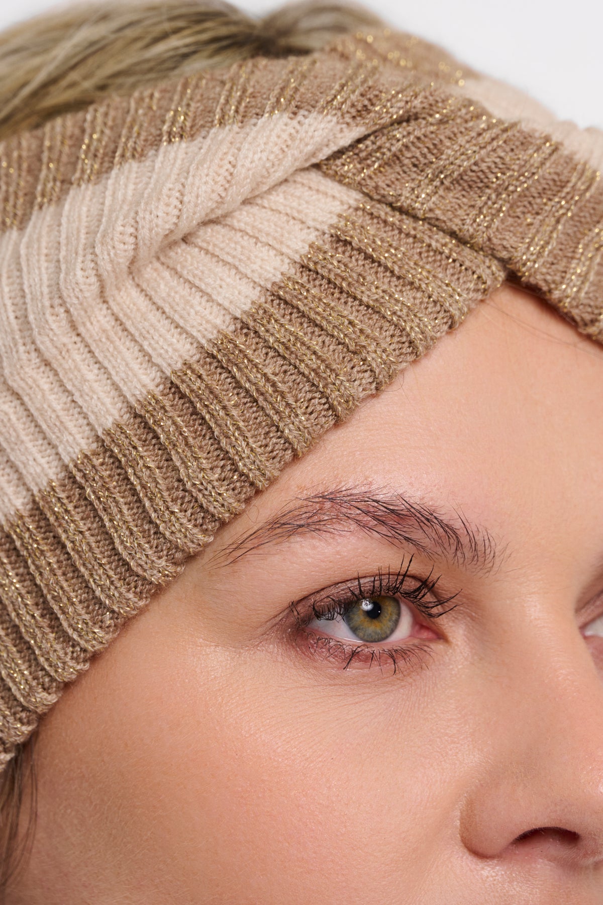 Iva is een beige/gouden gestreepte haarband.Samenstelling: 59% acryl, 30% polyester, 10% polyamide, 1% mettalic