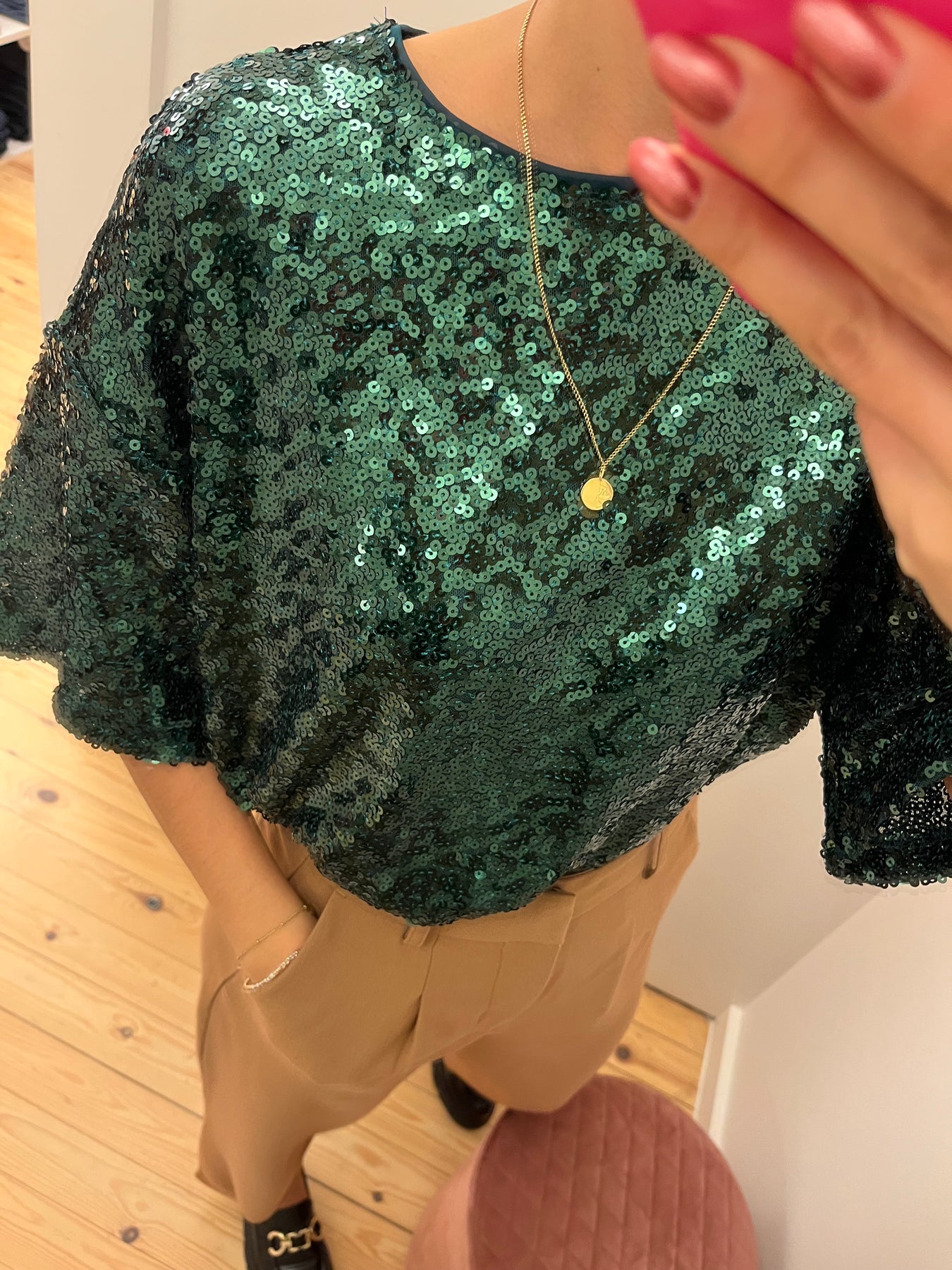 Myra is een groene blouse met pailletten, met ronde hals en korte mouwen.Fitting: valt ruimerSamenstelling: 95% polyester, 5% elasthan