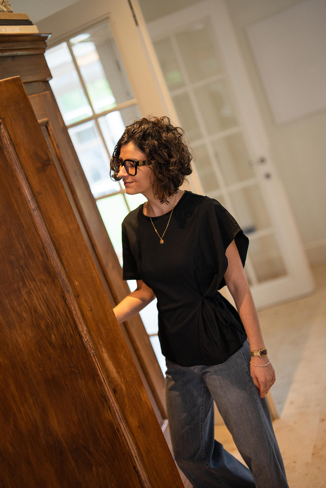 Nala is een zwart T-shirt met ronde hals, korte mouwen en knoopdetail.