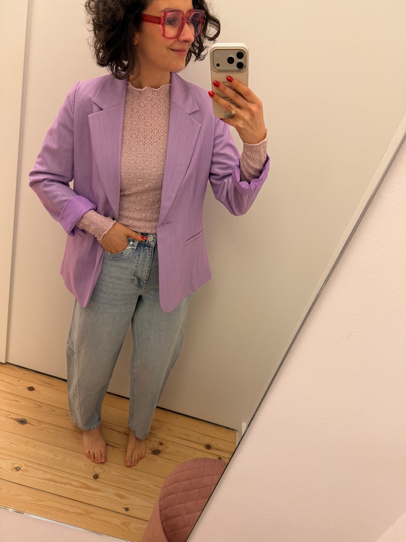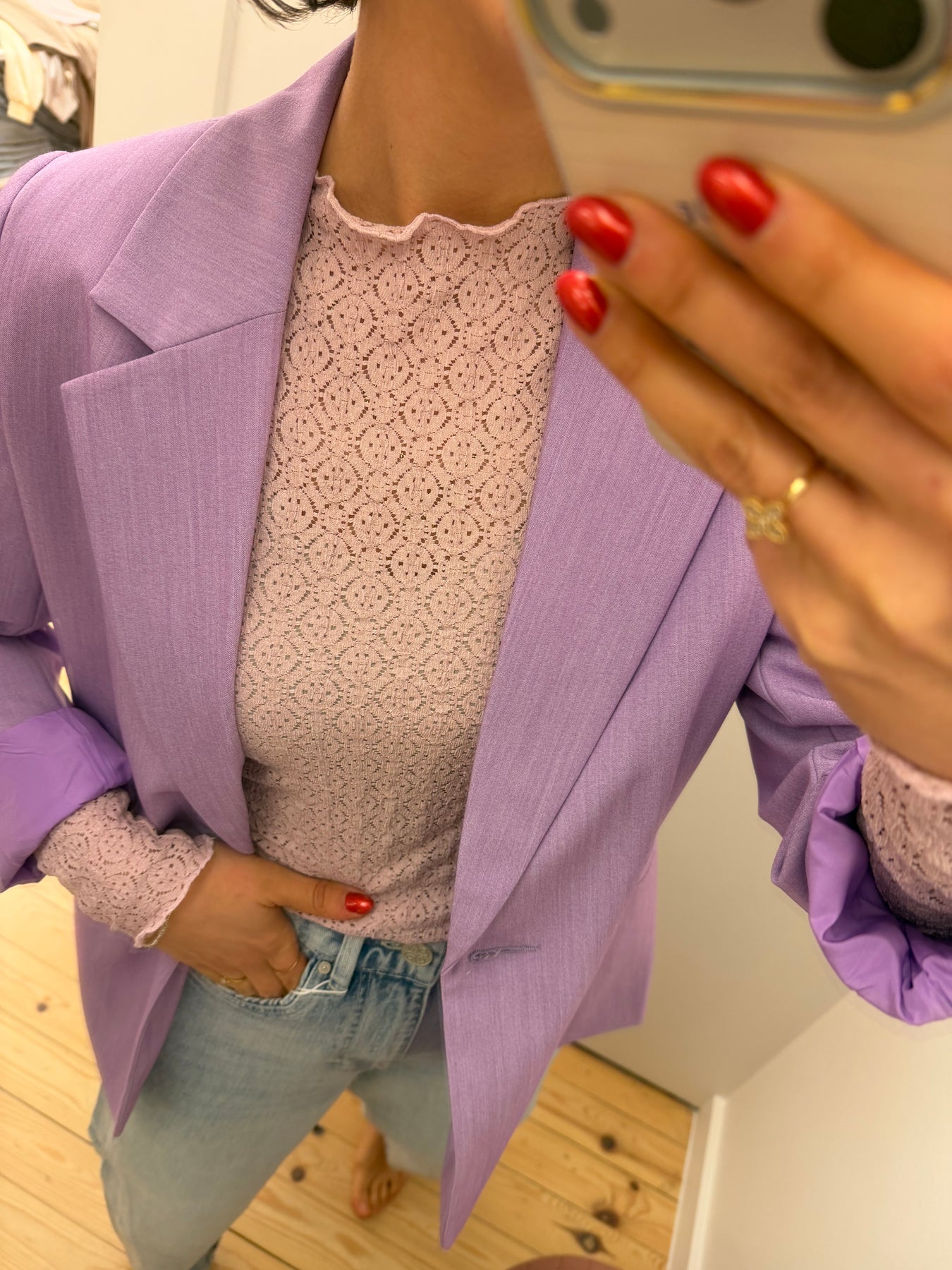 Nomi is een oudroze, kanten meshtop met lange mouwen.