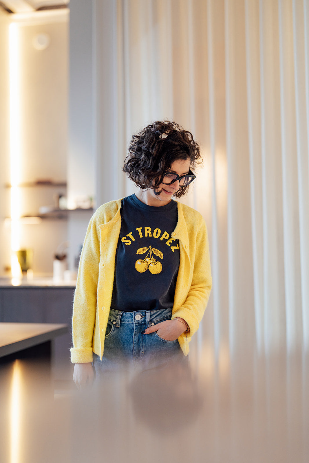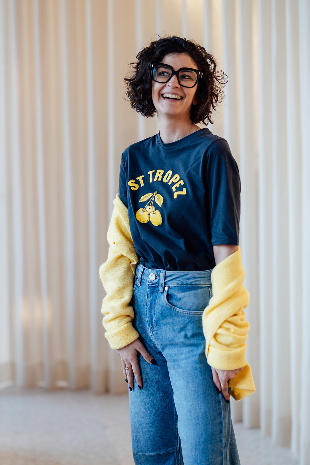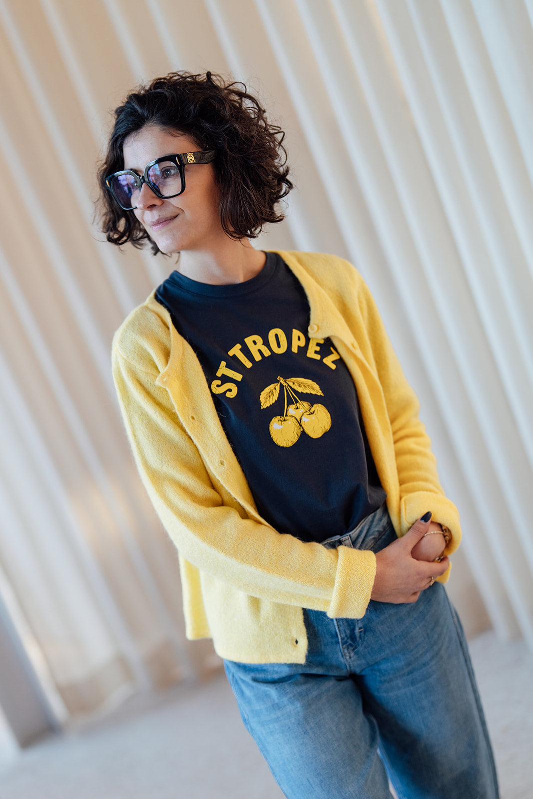 Octavia is een donkerblauw T-shirt met gele opdruk, ronde hals en korte mouwen.