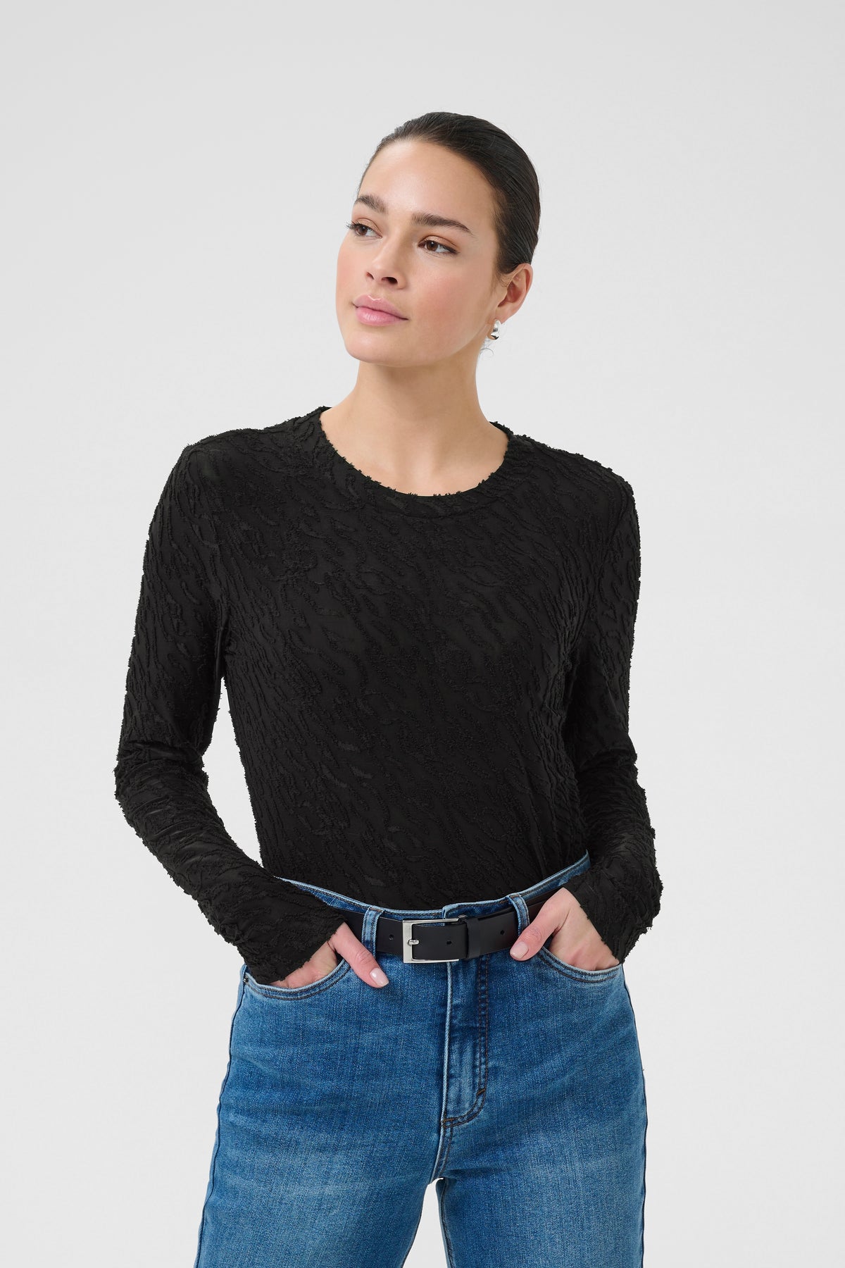 Zeverina is een zwart T-shirt in structuurstof met ronde hals en lange mouwen.Fitting: valt op maatSamenstelling: 95% polyester, 5% elasthan