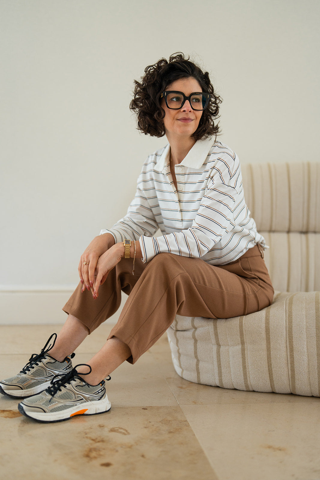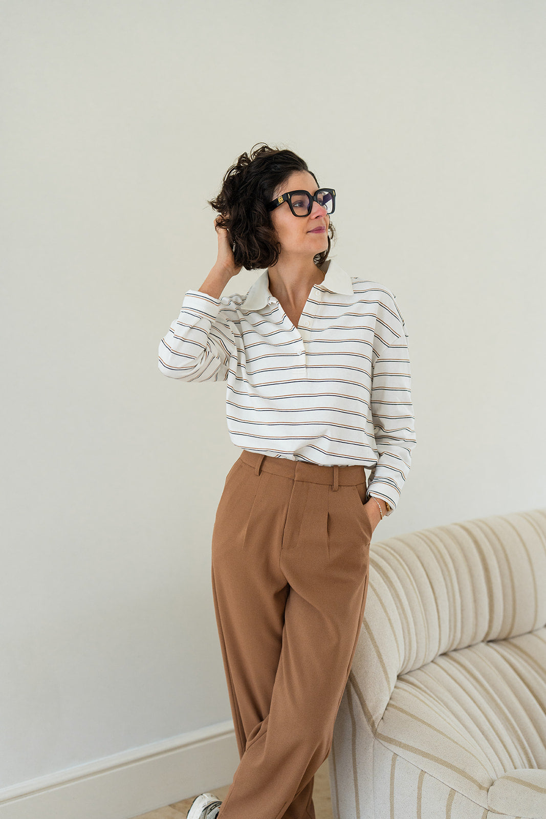 Anna is een ecru, gestreepte polo met lange mouwen.Fitting: valt ruimerSamenstelling: 100% katoen