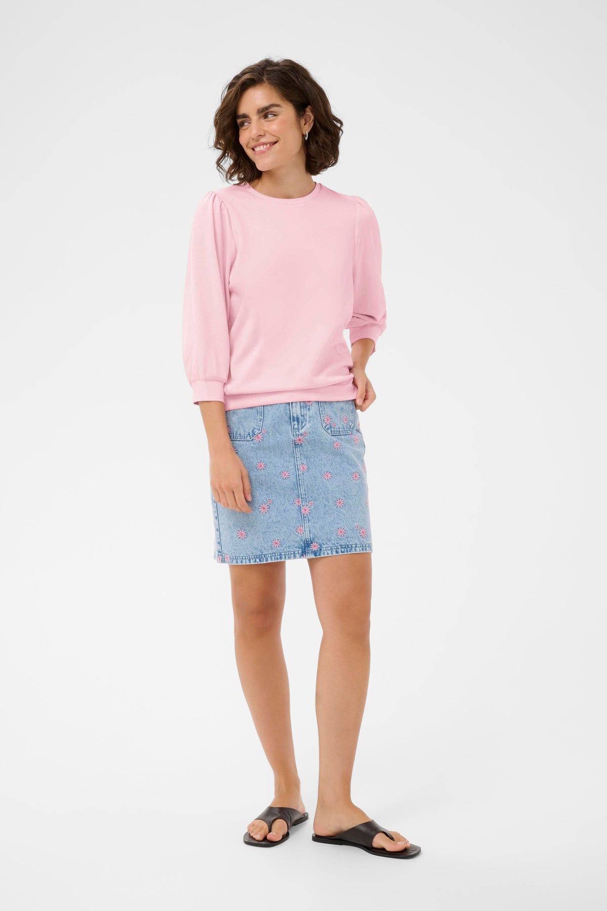 Annie is een roze sweater met ronde hals en halflange mouwen.