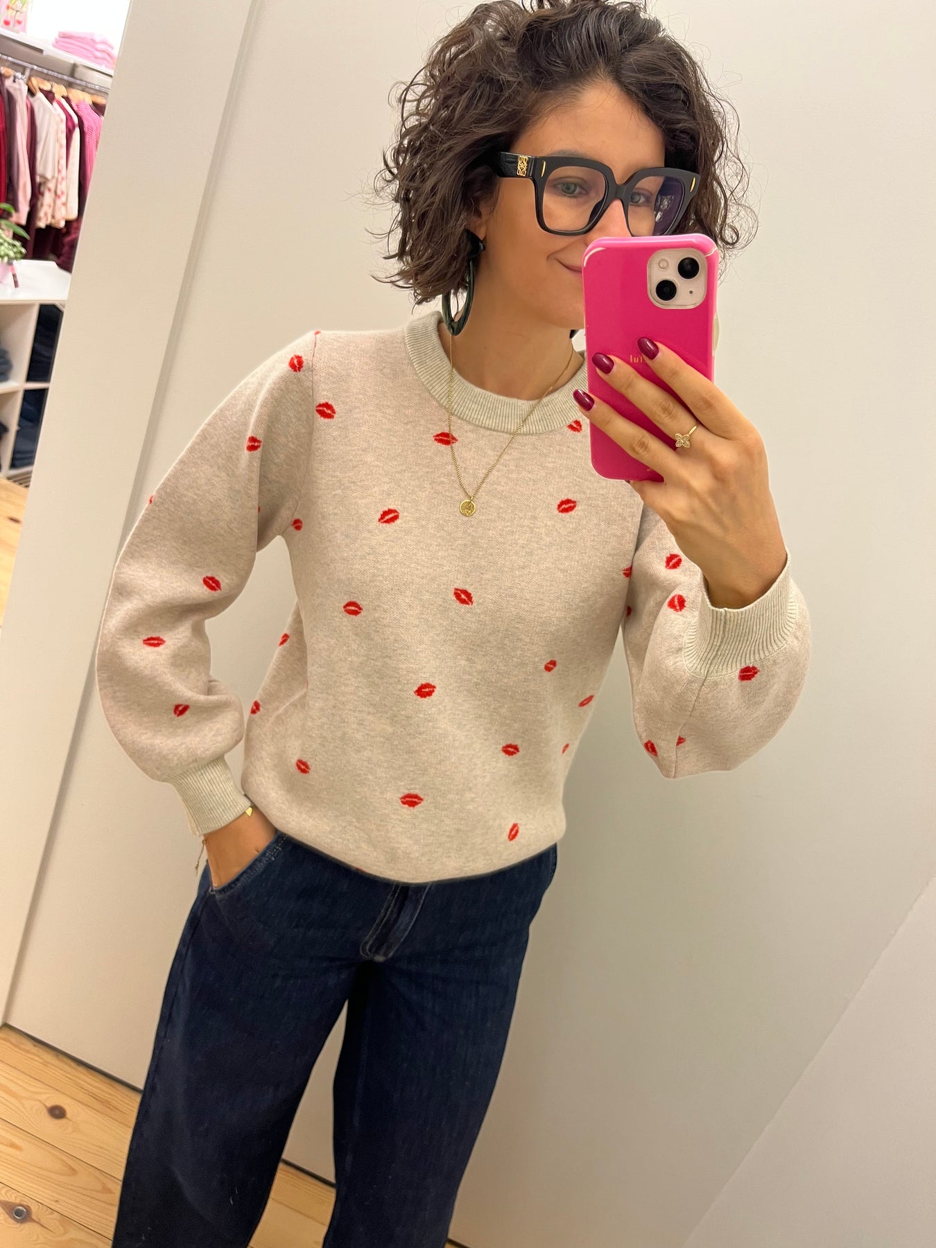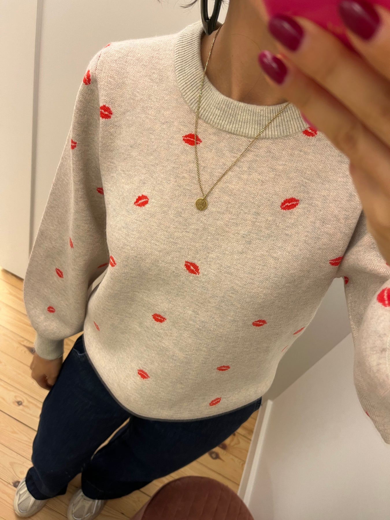 Brielle is een beige gemêleerde trui met rood motief, ronde hals en lange mouwen.Fitting: valt op maatSamenstelling: 64% polyester, 22% acryl, 14% nylon