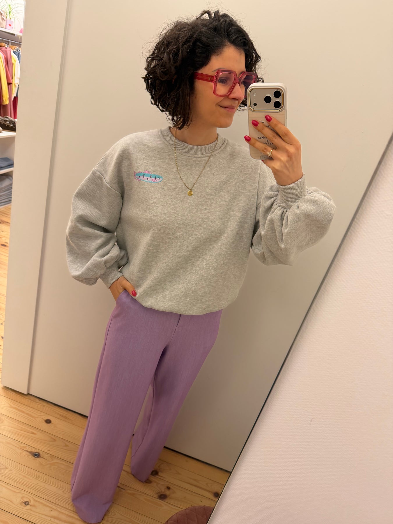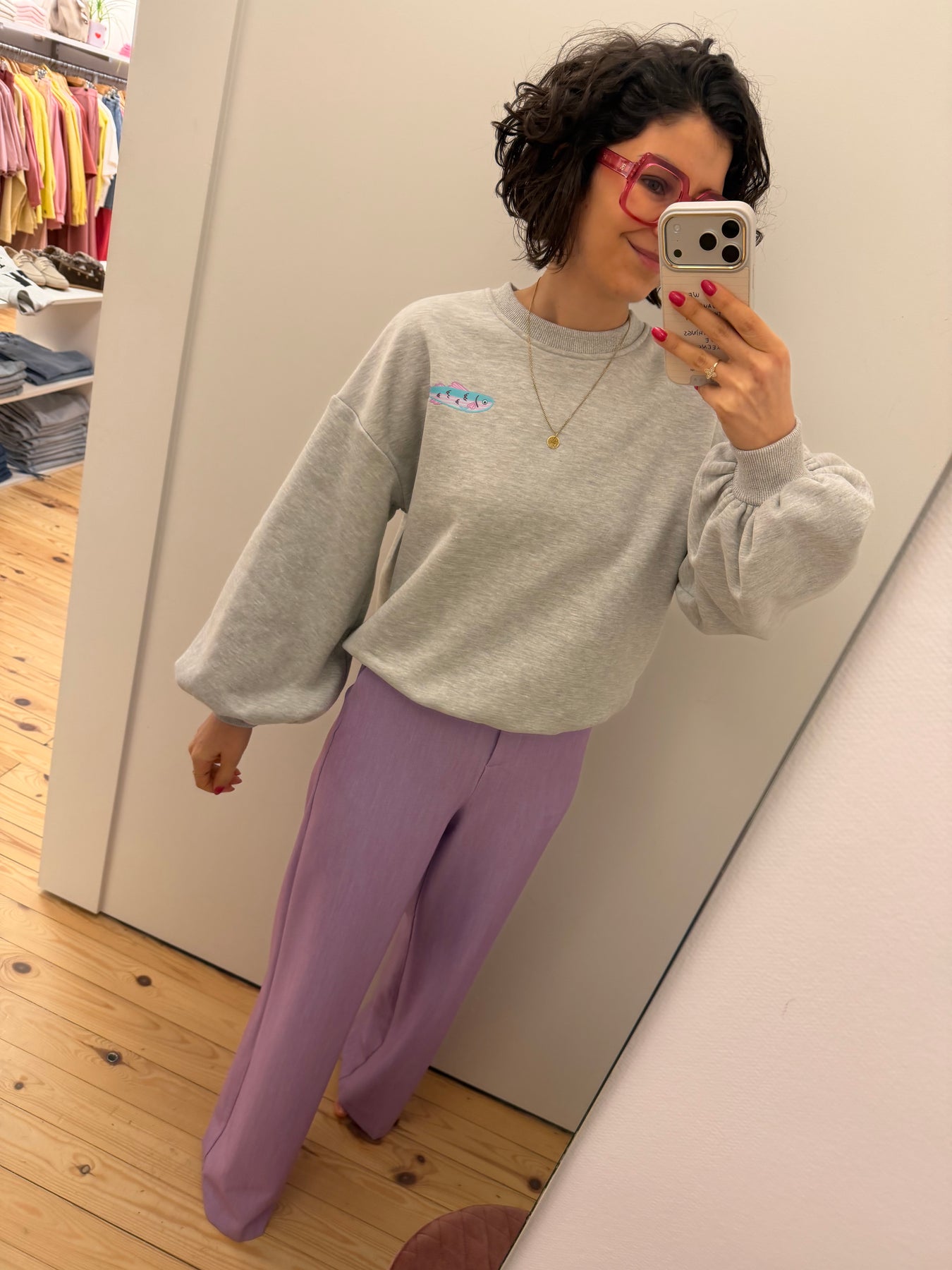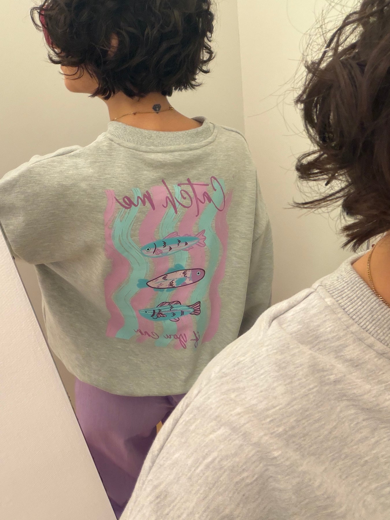 Catch me is een grijze sweater met een veelkleurige opdruk achteraan, ronde hals en lange mouwen.