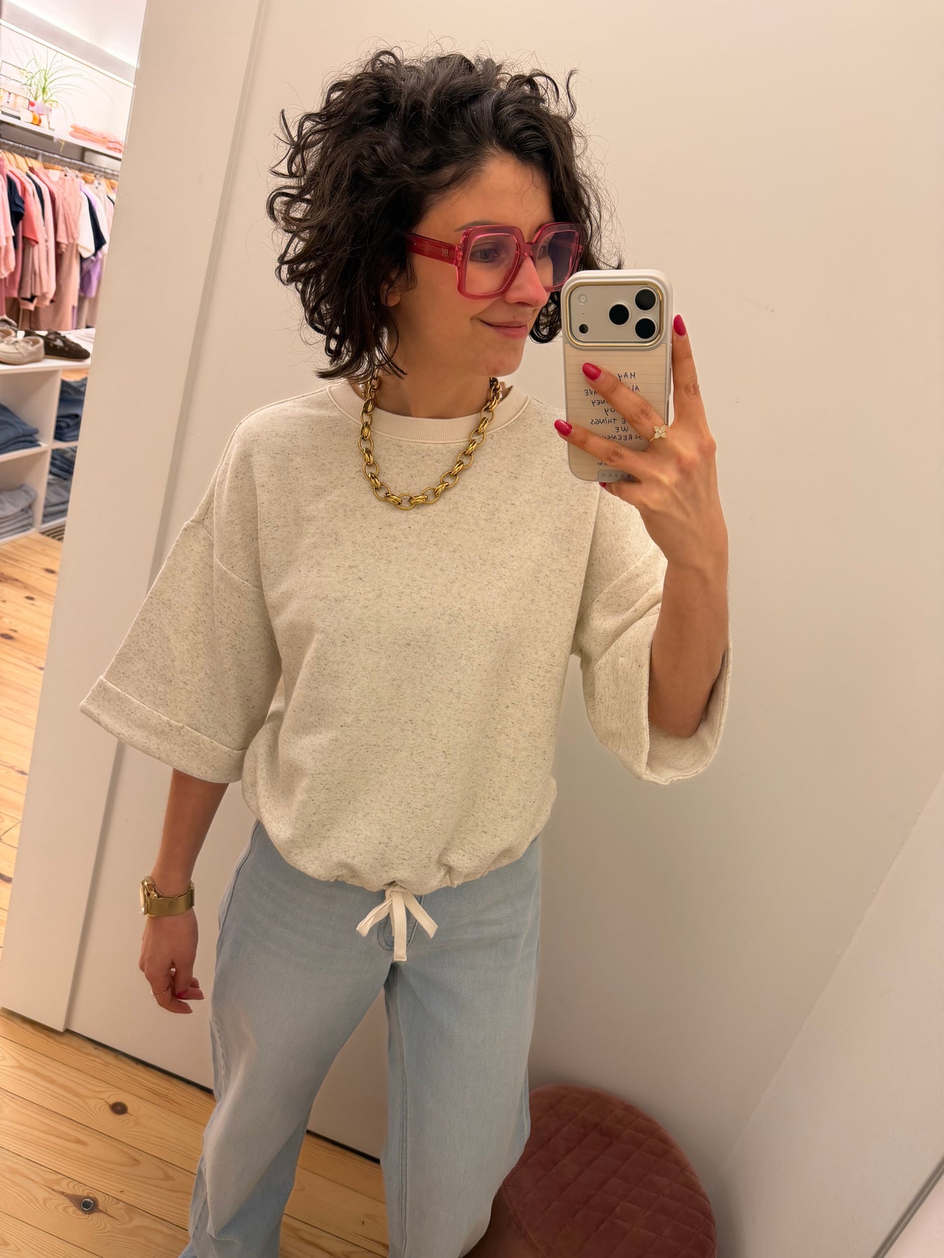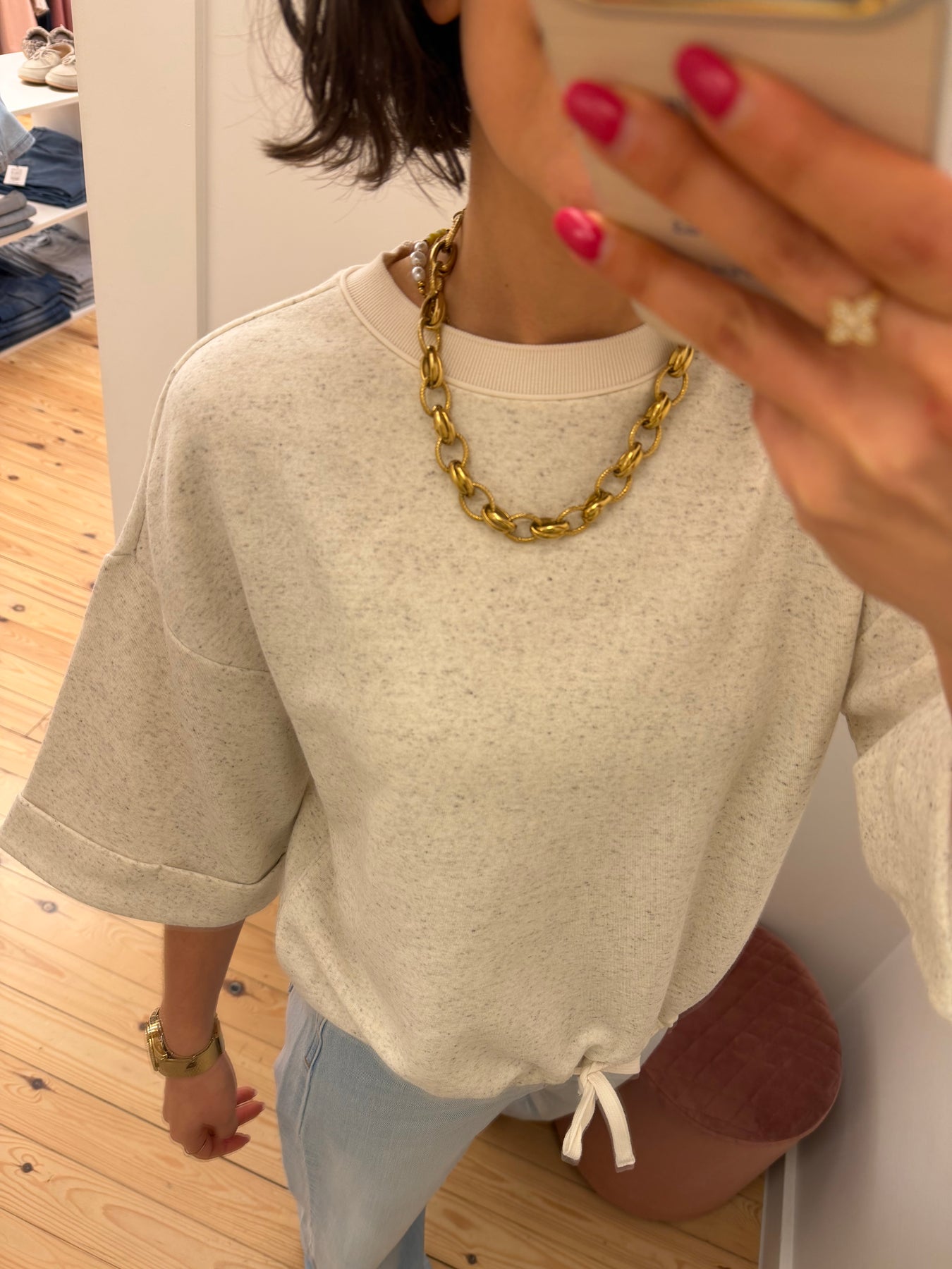 Cordy is een sweater met ronde hals en halflange mouwen.
