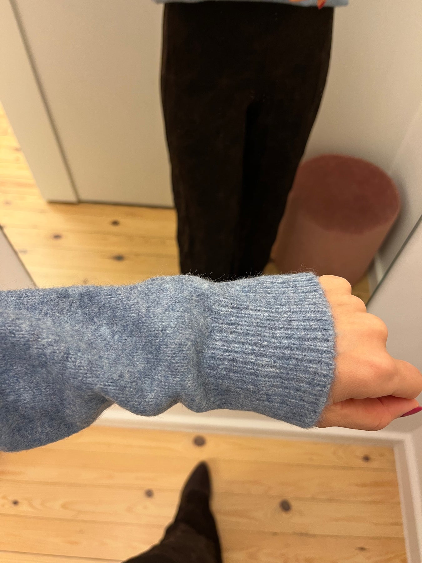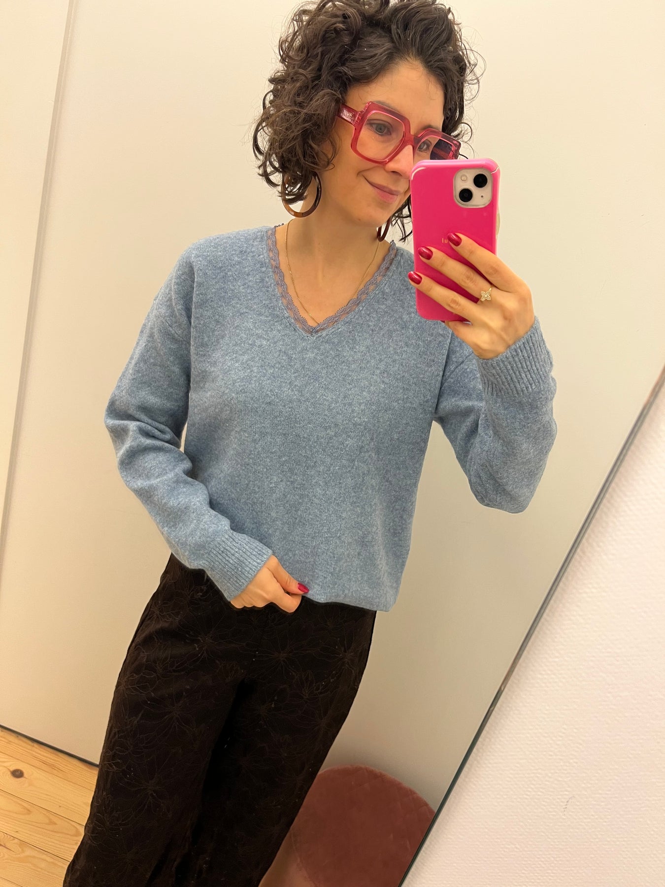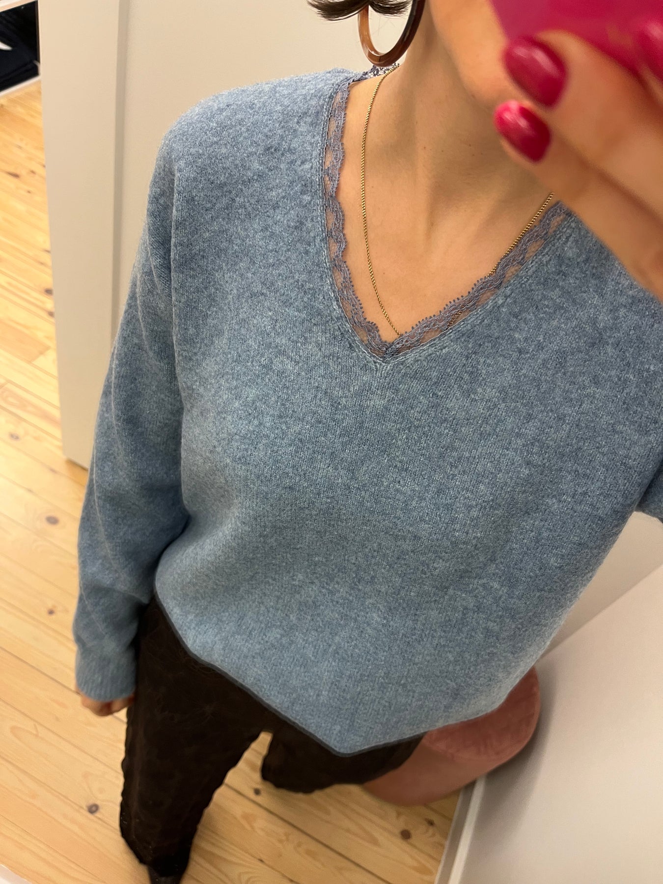 Ellen is een blauwe trui met V-hals en lange mouwen.Fitting: valt ruimSamenstelling: 57% acryl, 33% polyester, 8% wol, 2% elasthan