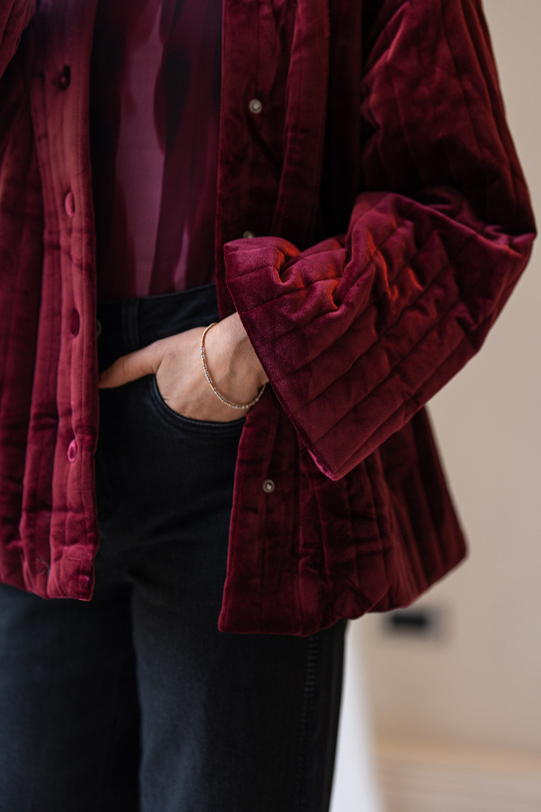 Evening is een bordeaux jas in fluweel met V-hals en lange mouwen. De jas sluit met drukknopen en heeft 2 steekzakken.Fitting: valt op maatSamenstelling: 95% polyester, 5% elasthan