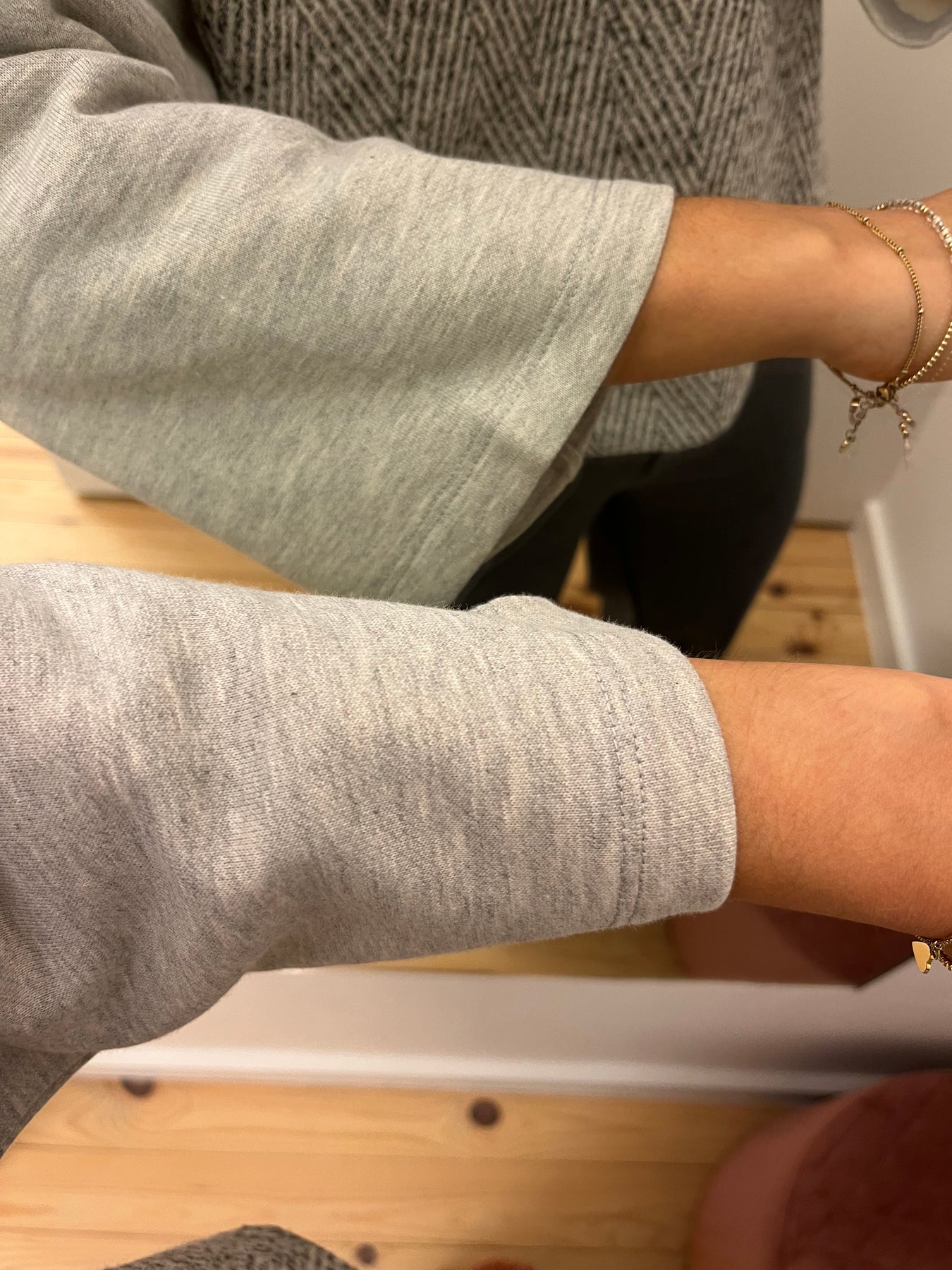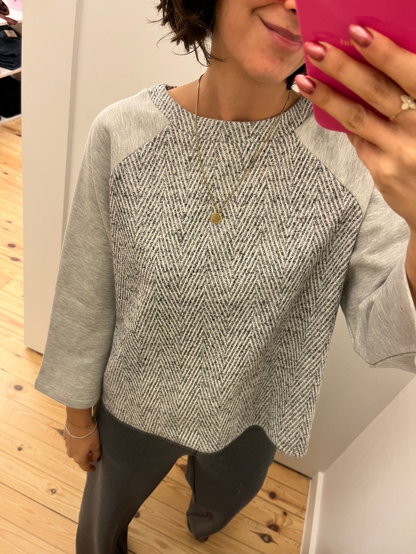 Harringbone is een grijze sweater in visgraatmotief met ronde hals en halflange raglanmouwen.Fitting: valt op maatSamenstelling: 45% polyester, 30% katoen, 25% viscose