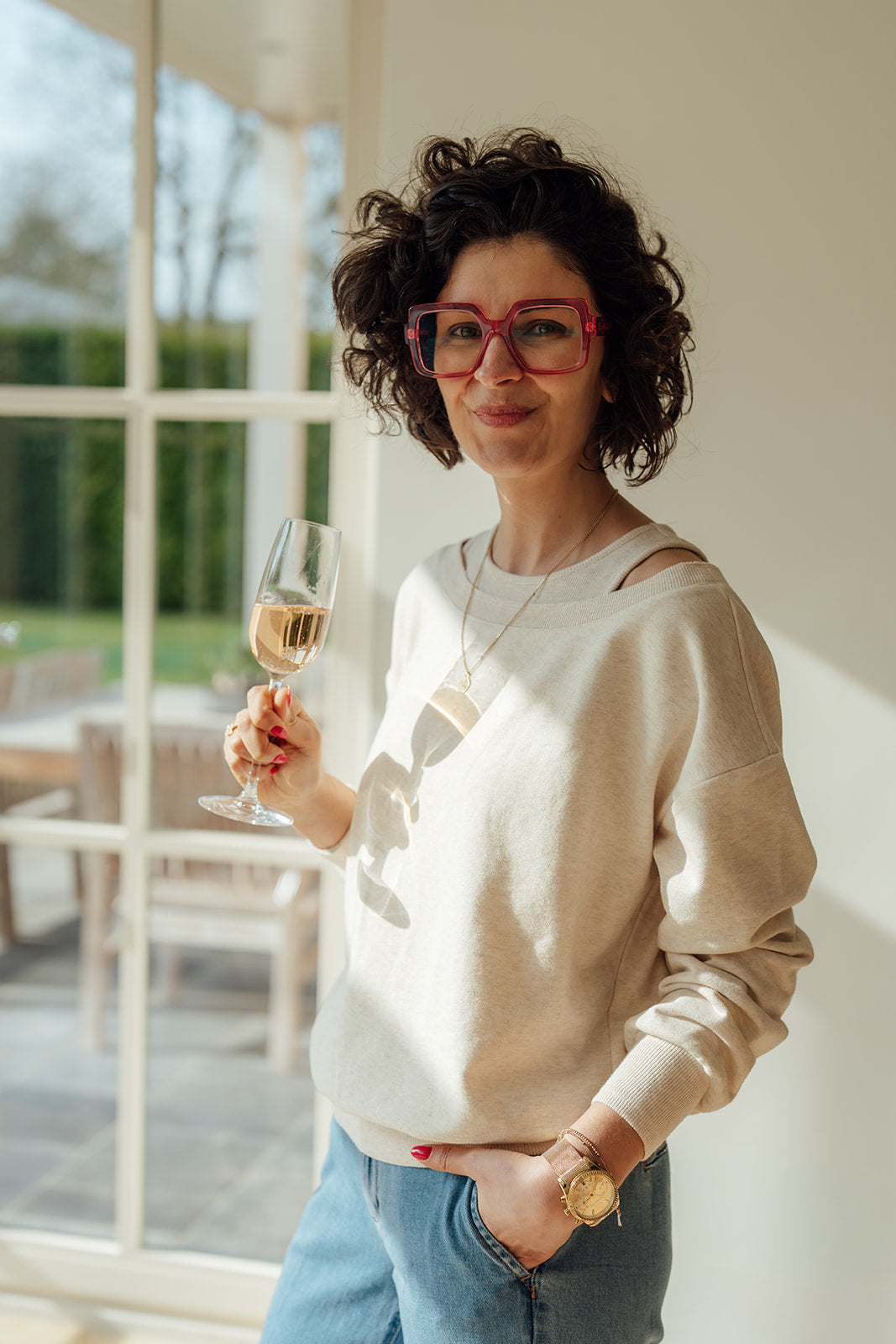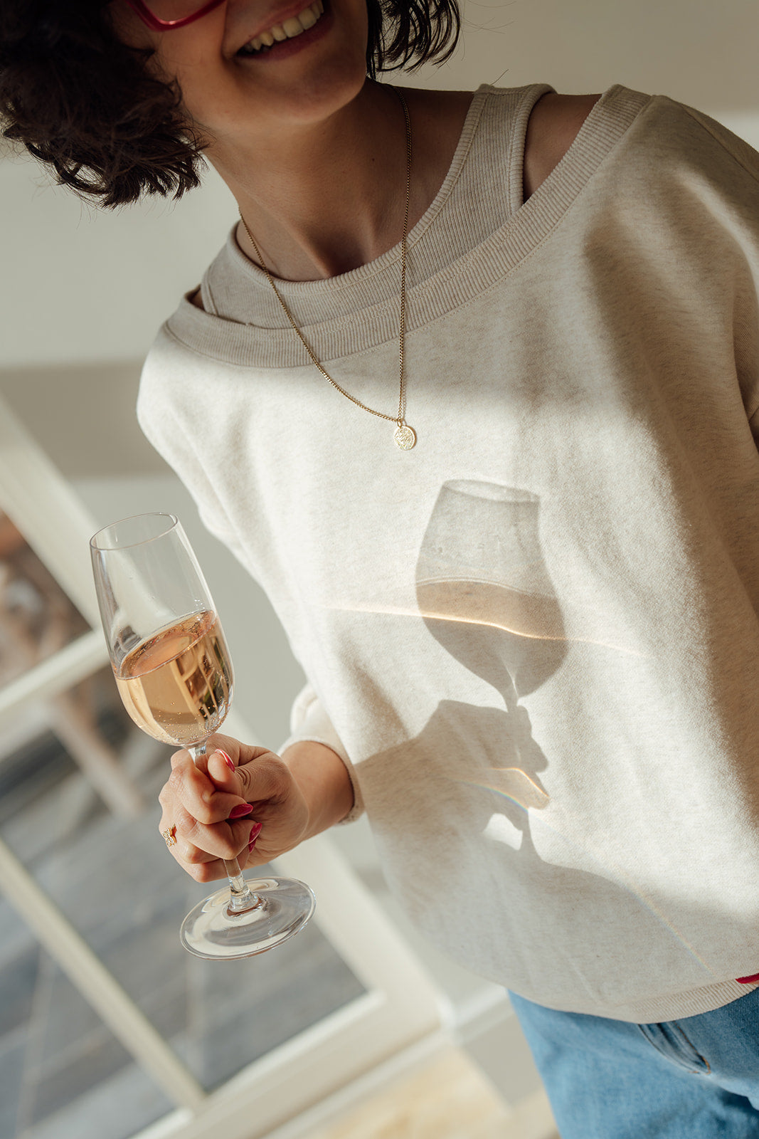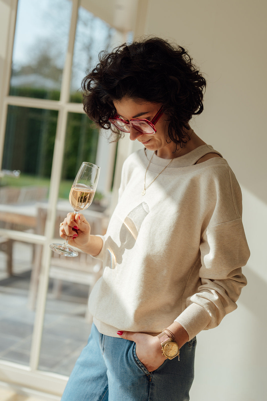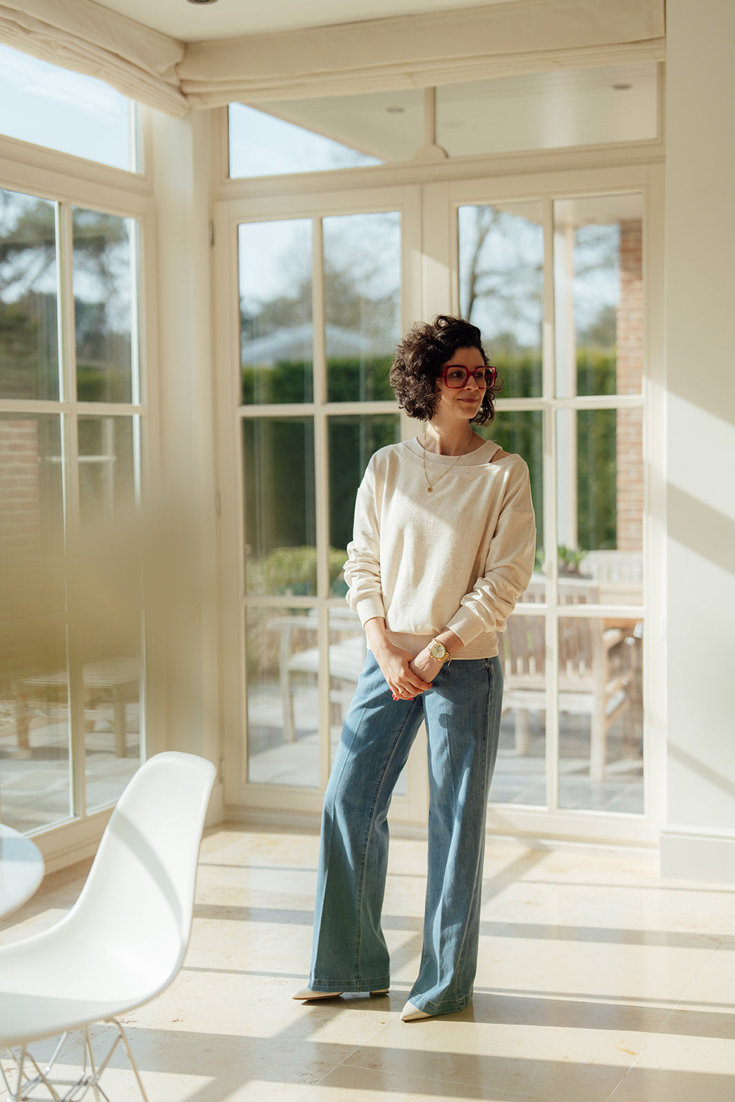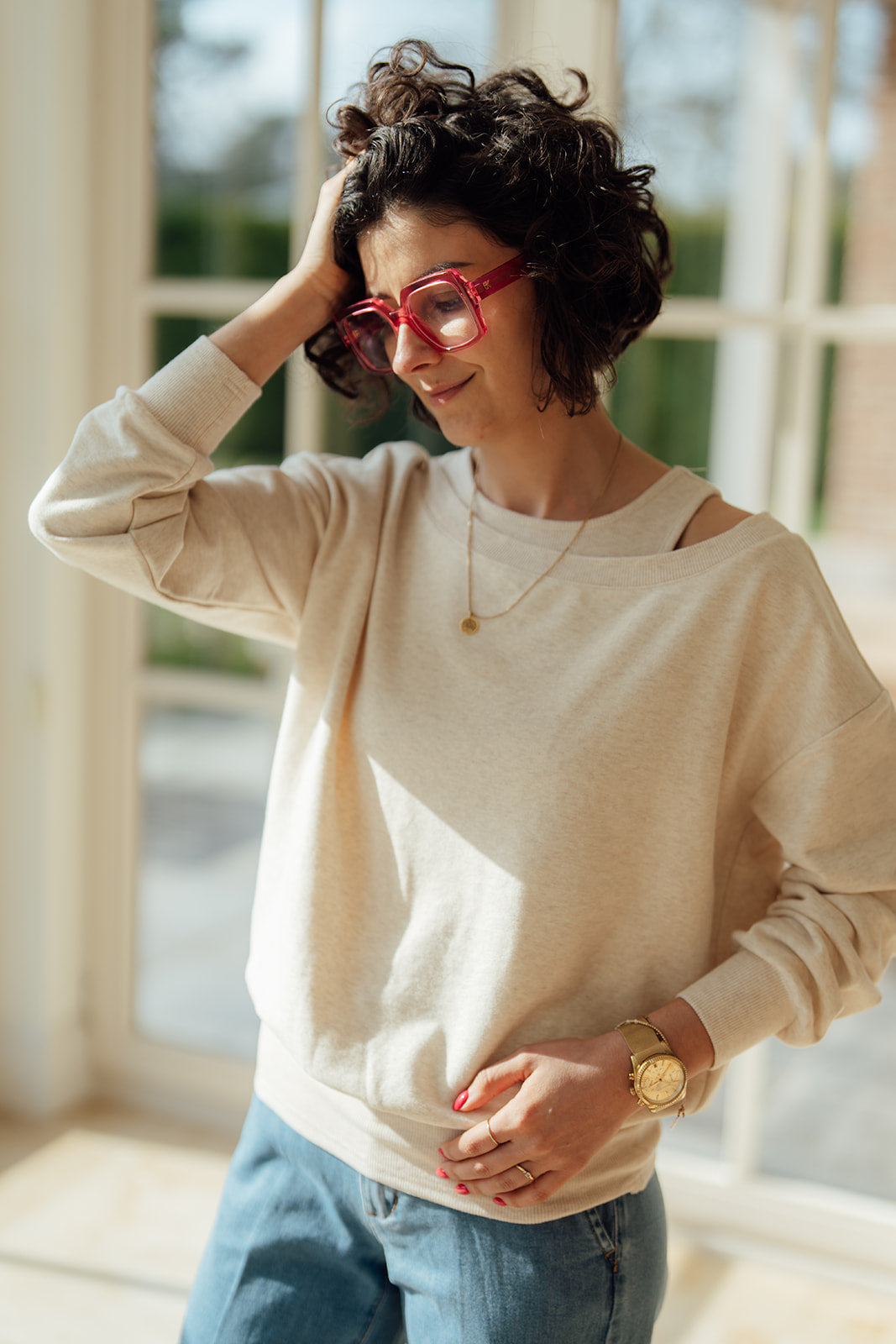 Mollie is een beige sweater met topje in verwerkt, boothals en lange mouwen.