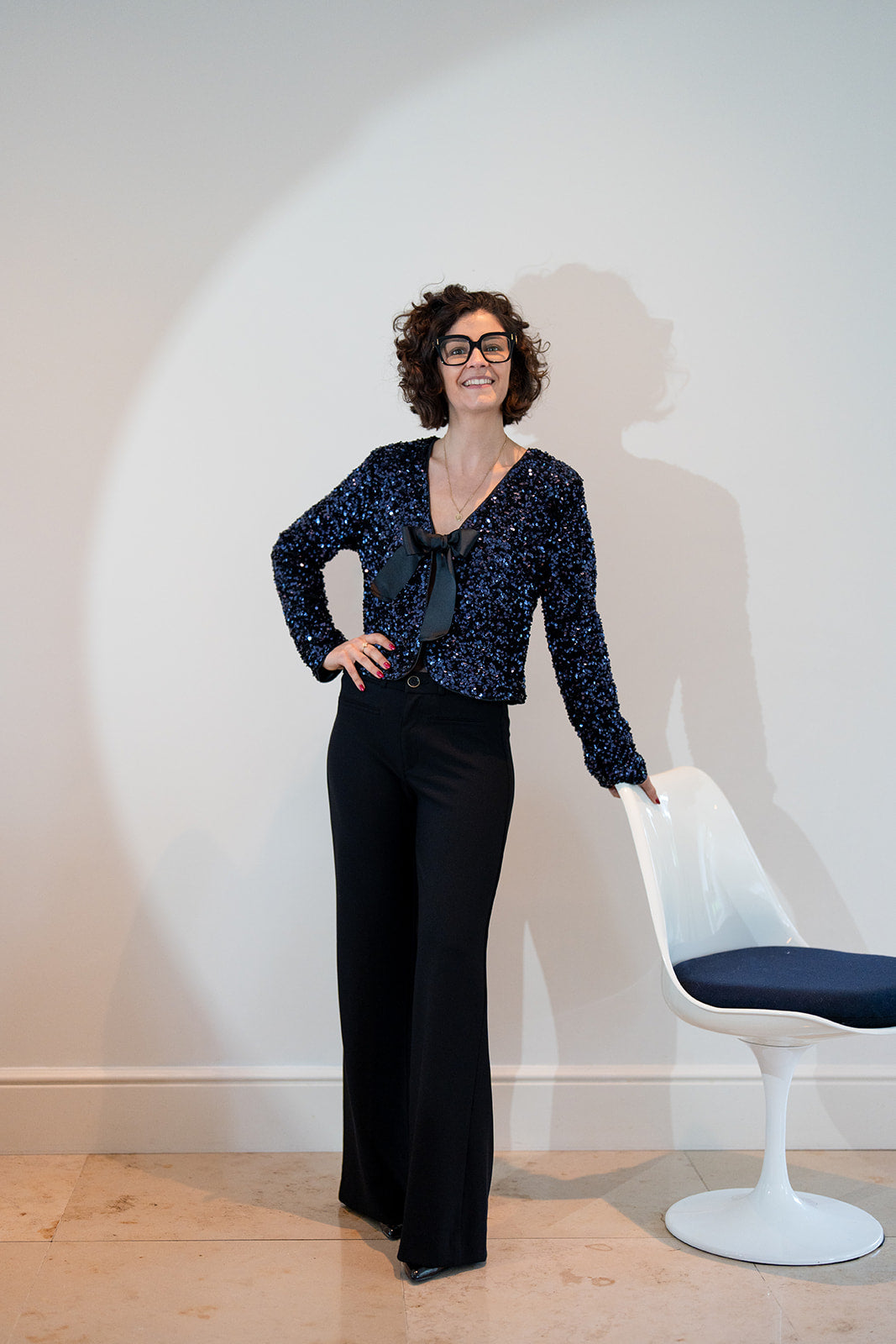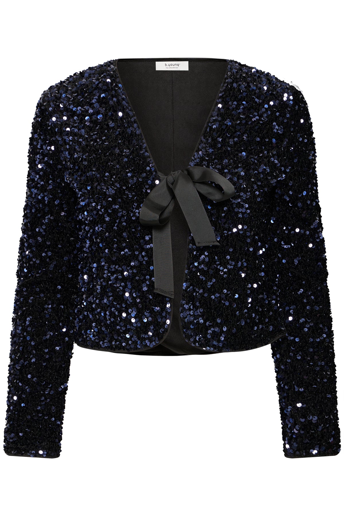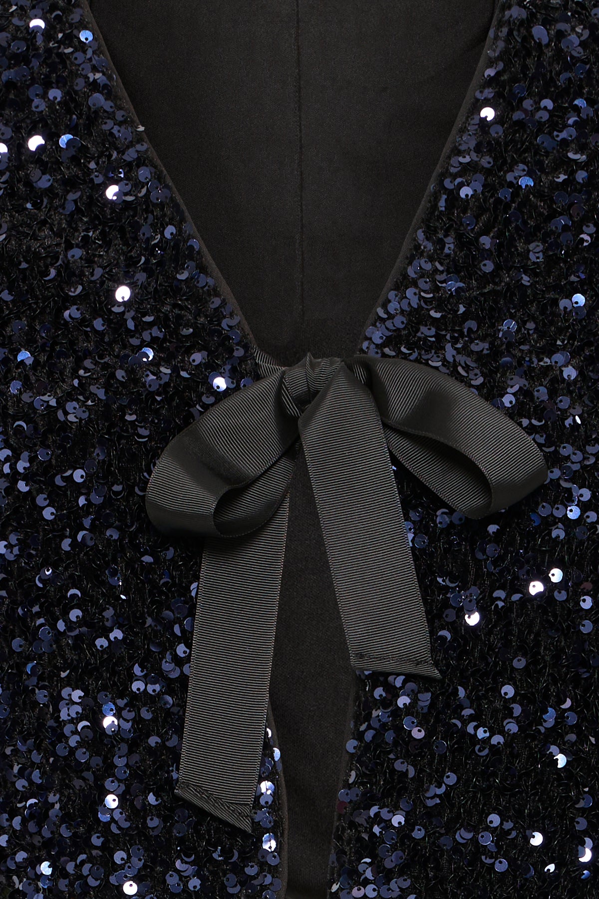 Paillet is een blauw vestje met pailletten, lange mouwen, V-hals en sluiting met striklint. Het vestje is gevoerd.