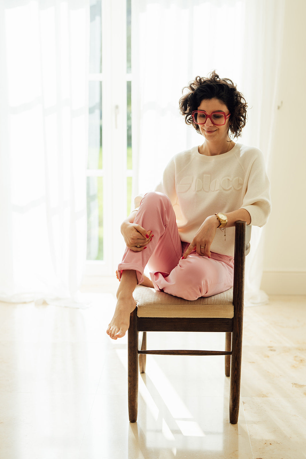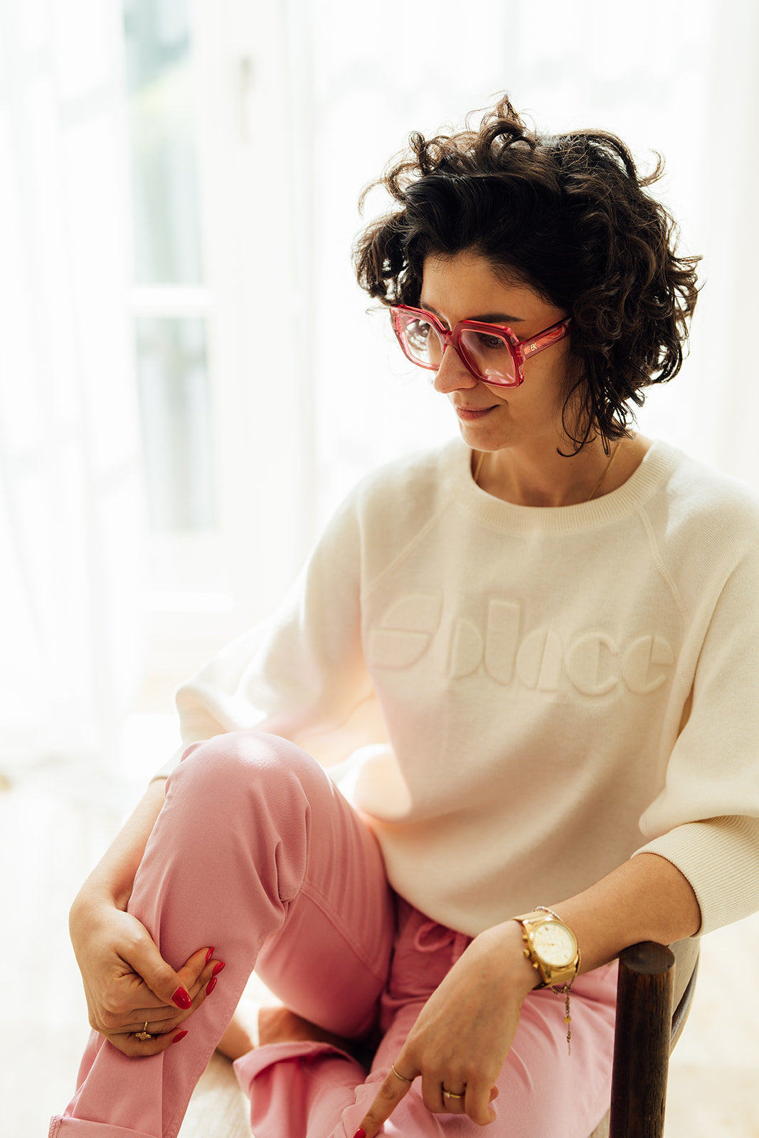 Raggie is een ecru sweater met ronde hals, halflange raglanmouwen.