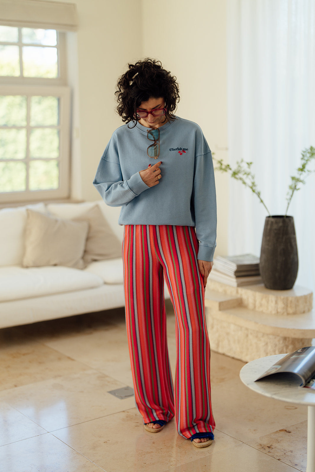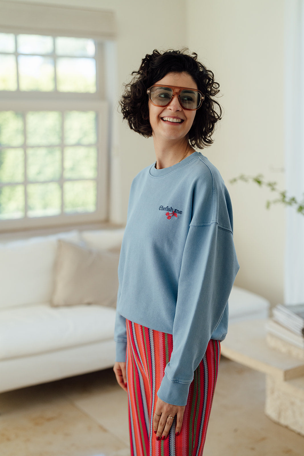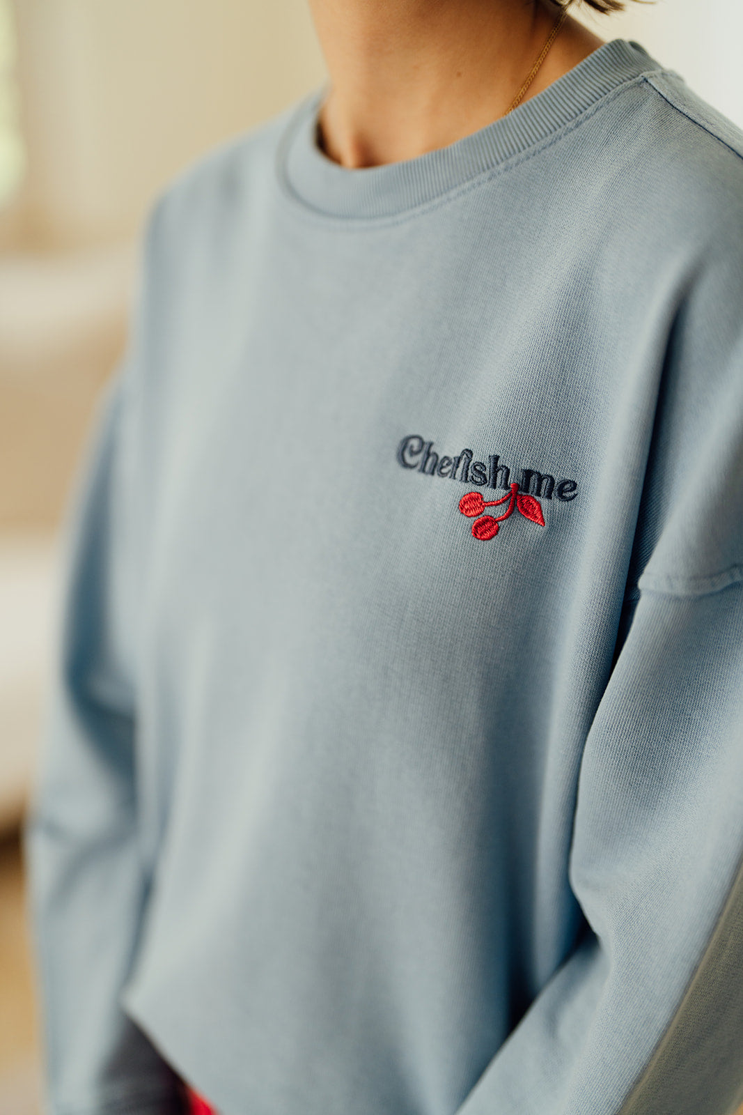 Rasma is een blauwe sweater met ronde hals en lange mouwen.